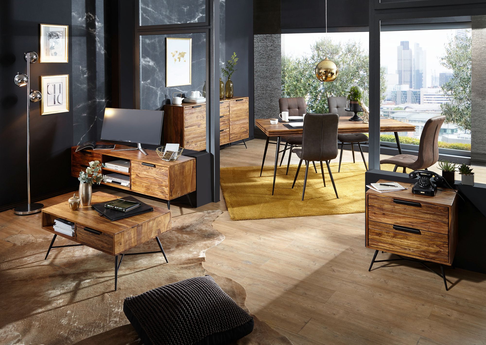 This Sheesham solid wood nightstand adds industrial style and practical storage to your bedroom. Featuring natural wood tones paired with a matte black metal frame, it offers robust stability and handcrafted uniqueness through natural wood grain.