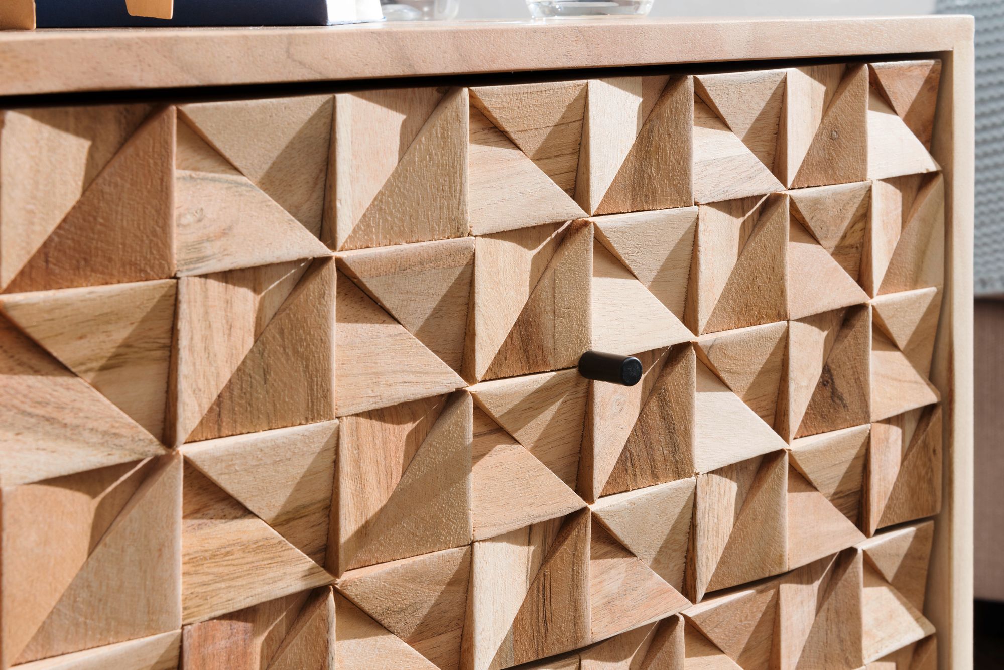 The handcrafted finish highlights the natural wood grain, complemented by black metal handles that emphasize its style.