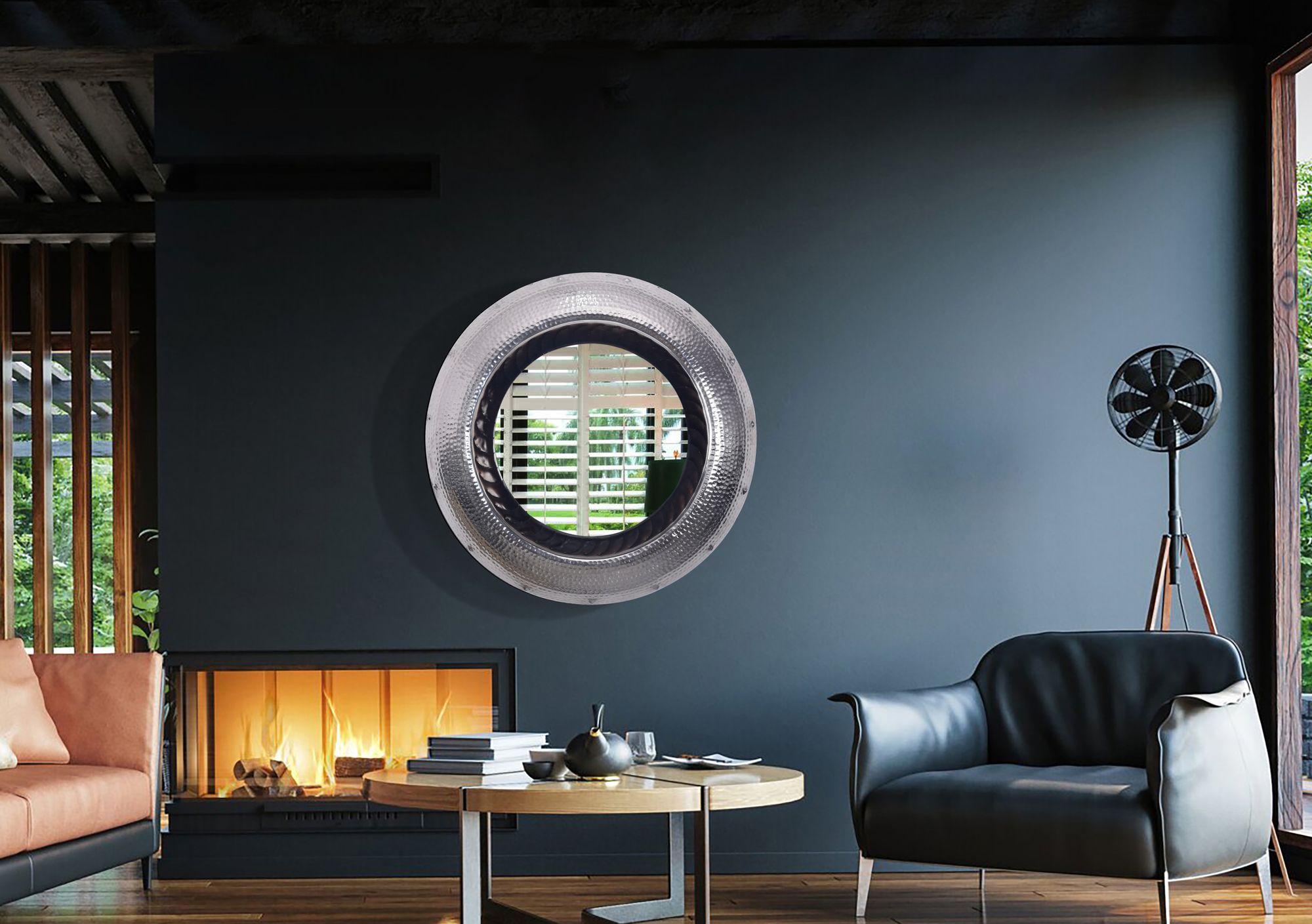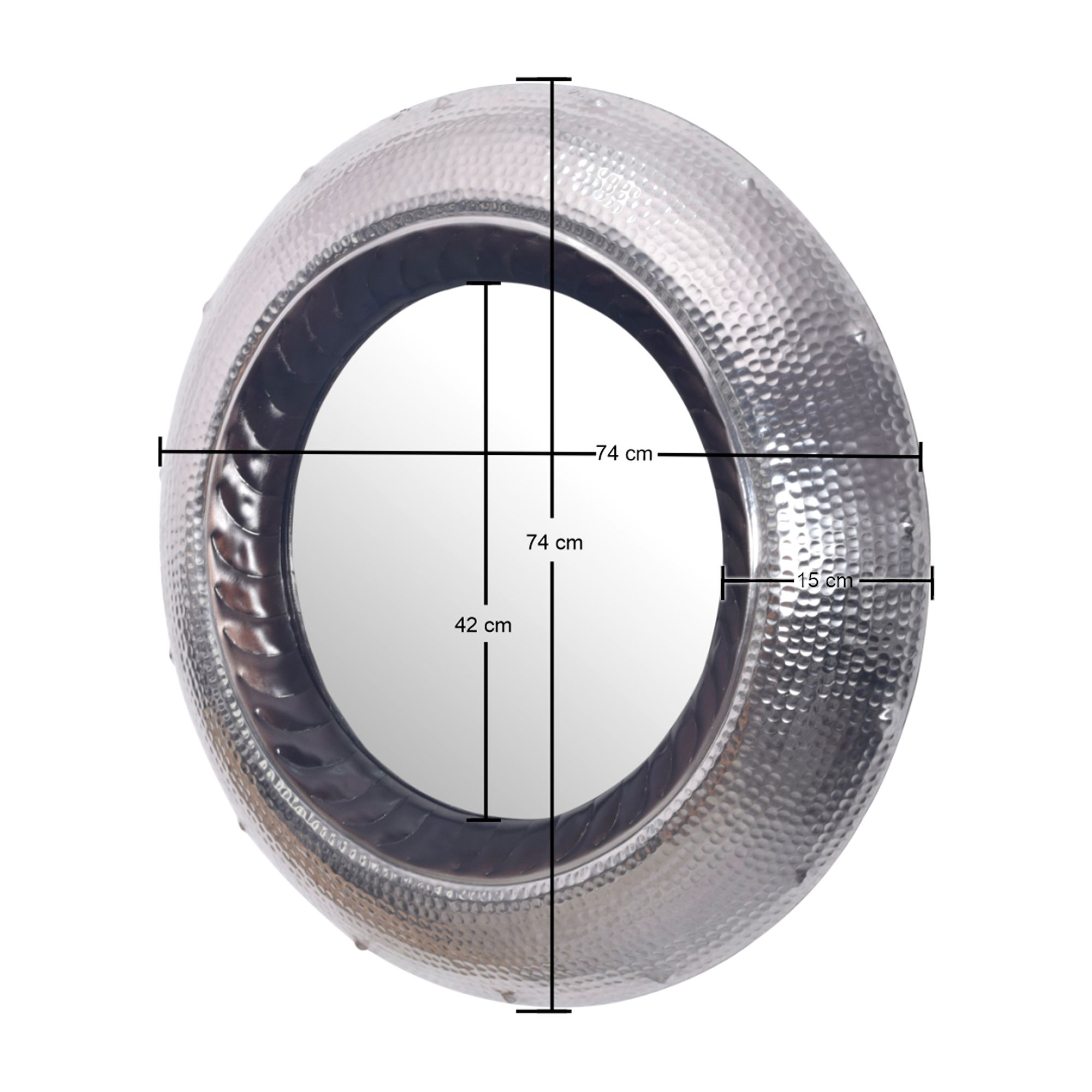 Add a touch of elegance to your home with this high-quality round wall mirror featuring a silver hammered aluminum frame. Measuring 74x74 cm, this unique design fits seamlessly into hallways, living rooms, or bedrooms.
