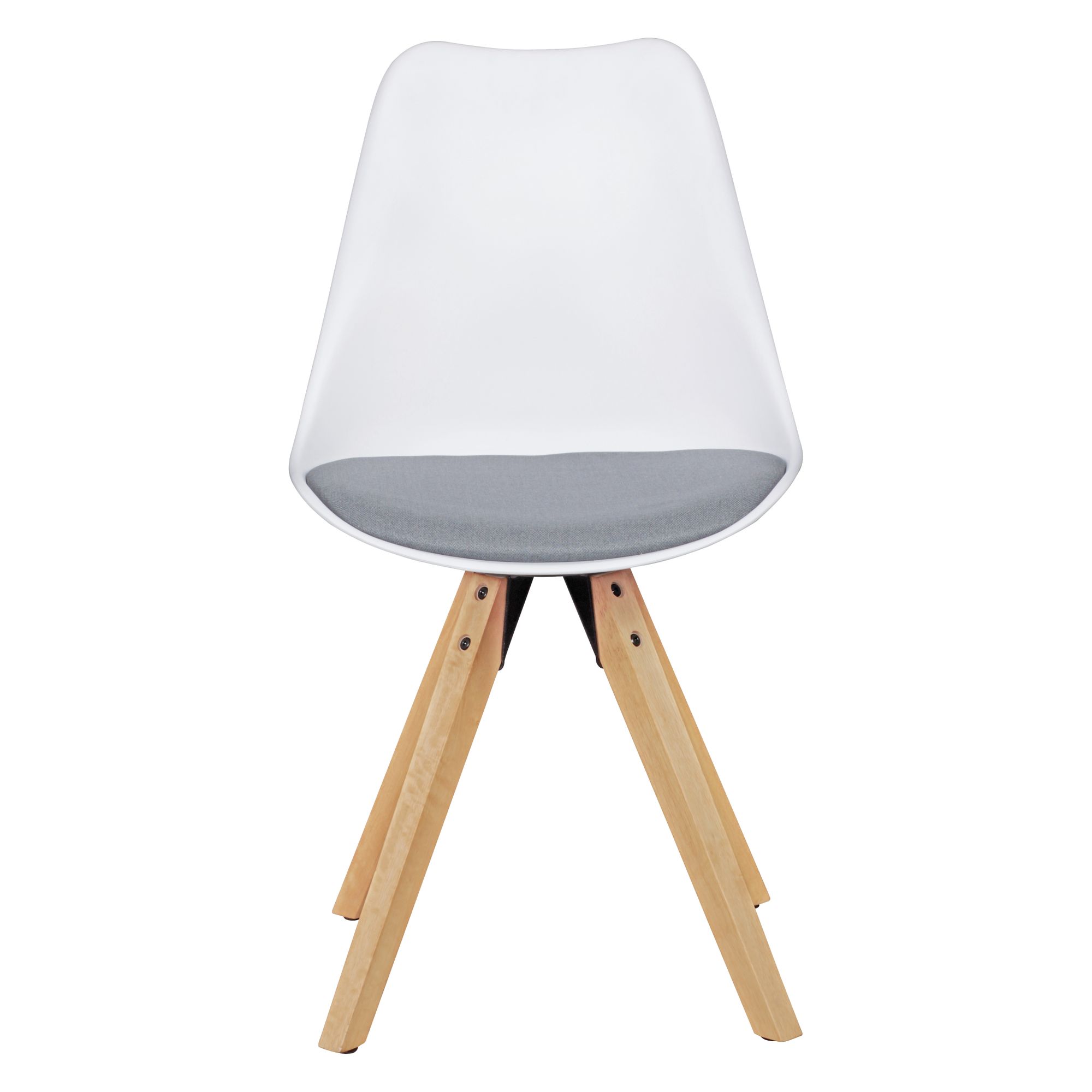 Discover this 2-piece set of LIMA retro dining chairs combining Scandinavian design with optimal comfort thanks to their grey upholstered fabric cushions and elegant white shells.