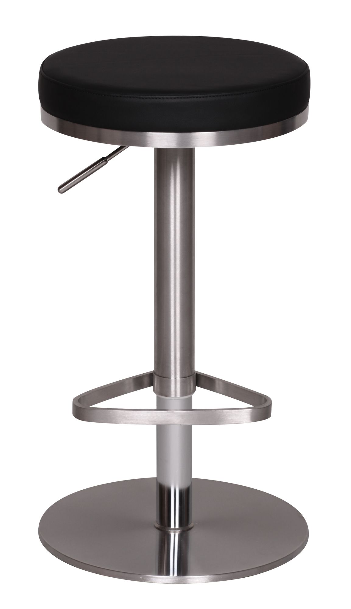 This modern black bar stool features an adjustable seat height from 57 to 82 cm for personalized comfort. The round, thickly padded black synthetic leather seat is framed by a chrome stainless steel ring.