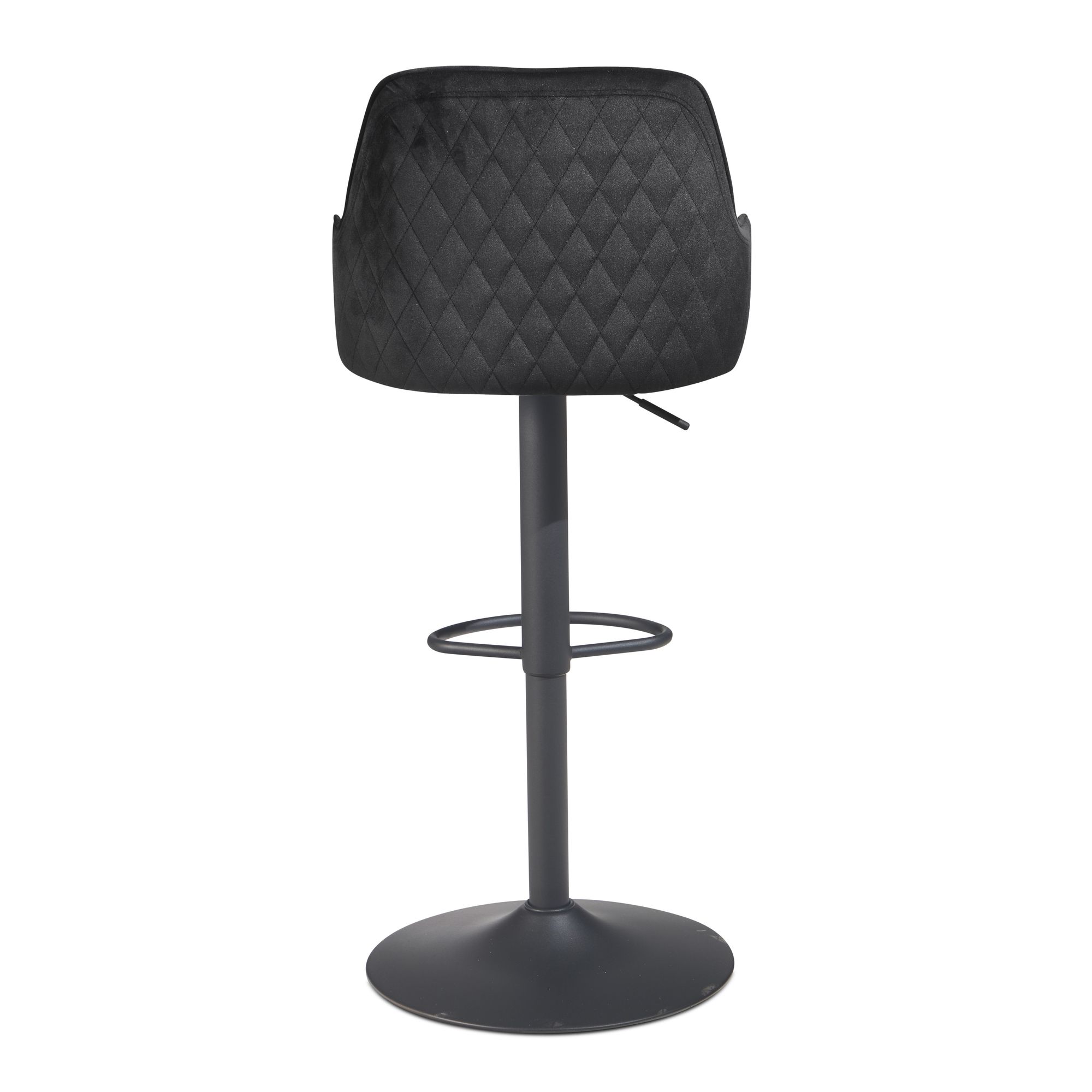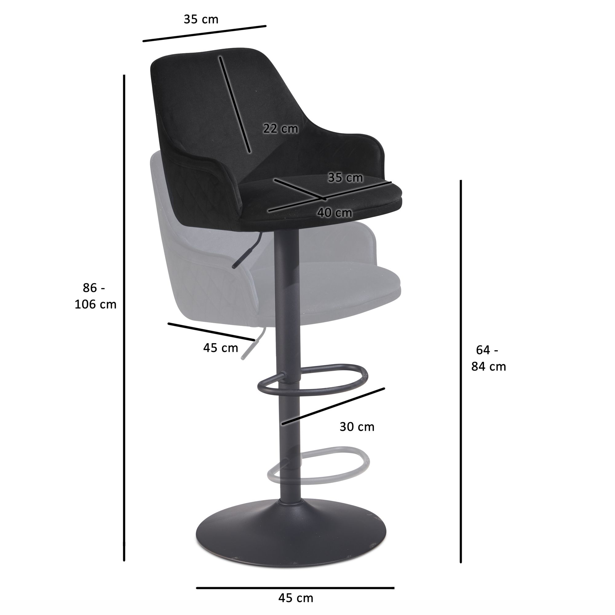Experience comfort and modern design with this black velvet bar stool featuring an adjustable height from 86 to 106 cm. The ergonomically shaped seat with diamond stitching on armrests and backrest provides excellent seating comfort. The metal trumpet base offers sturdy support and a sleek contrast to the soft velvet upholstery.