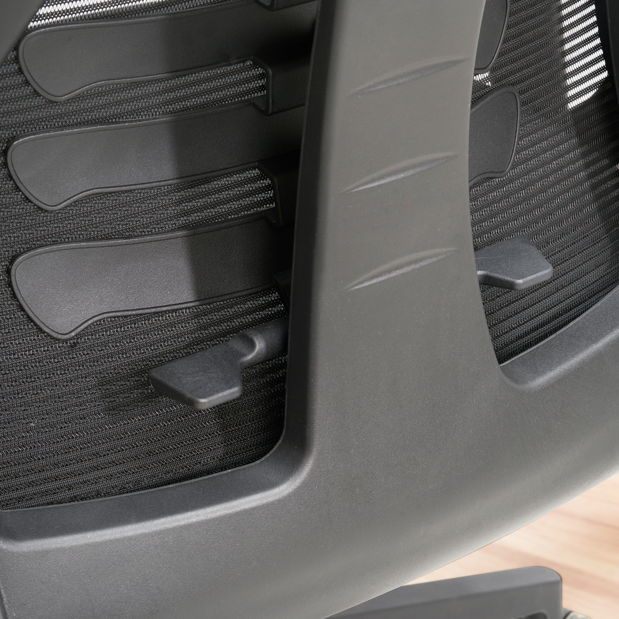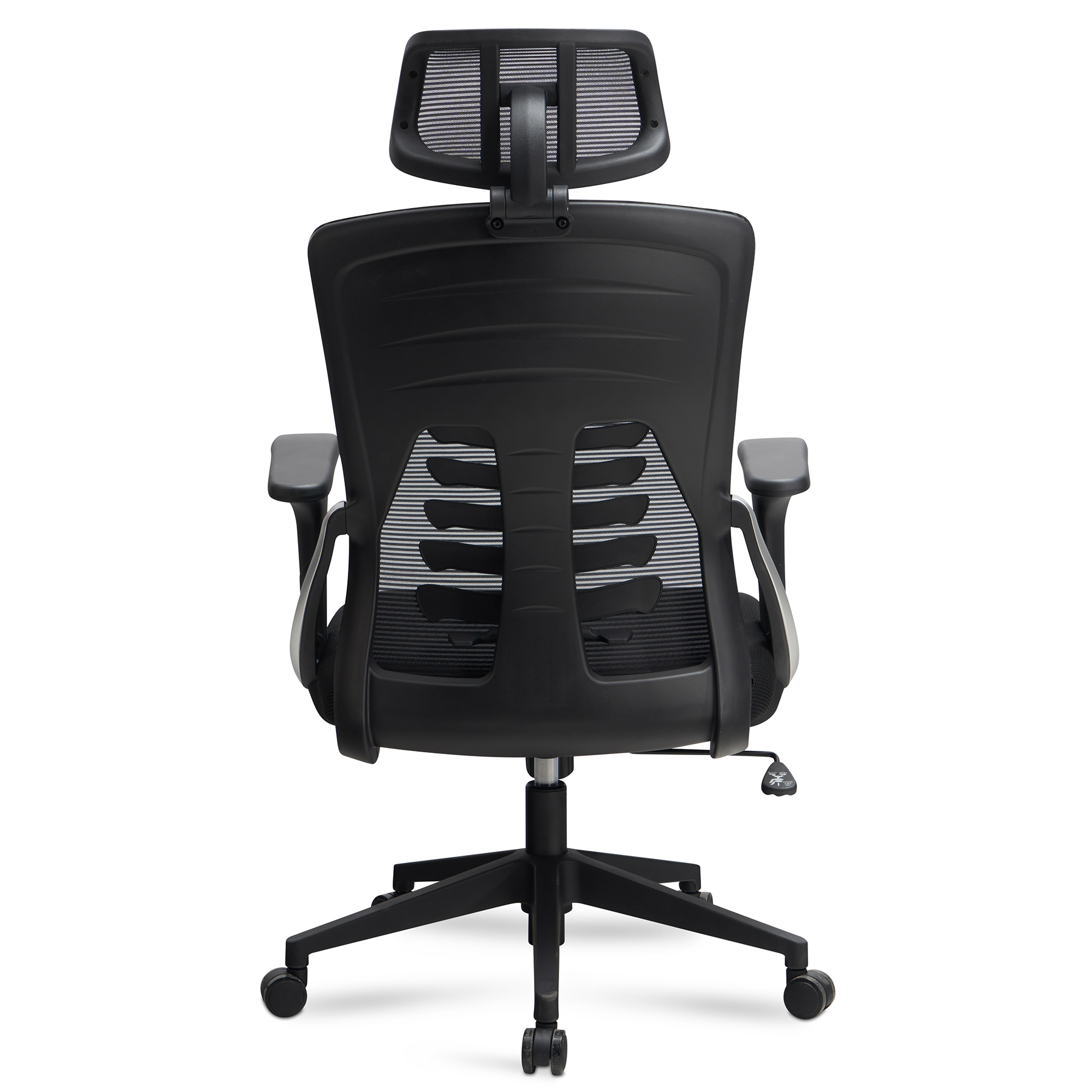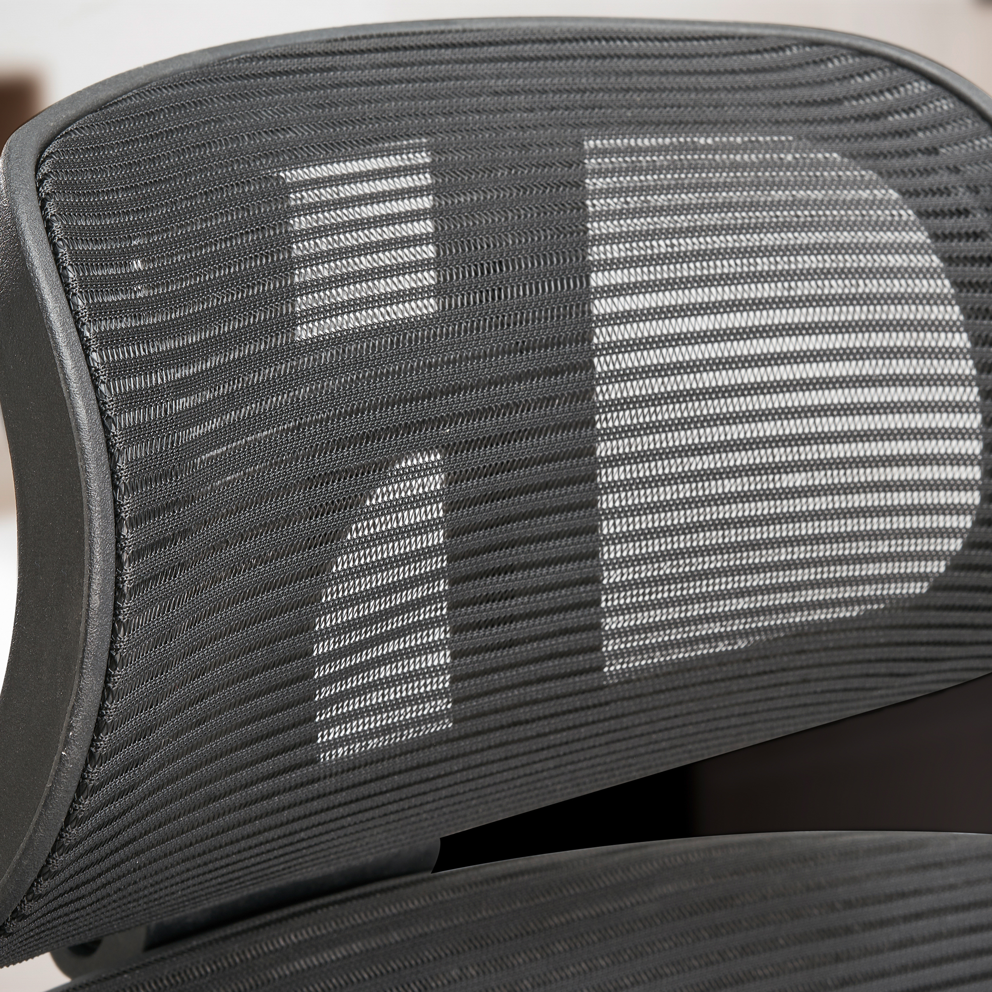 - Materials: 100% polyester mesh seat, backrest and headrest; plastic base and armrests
