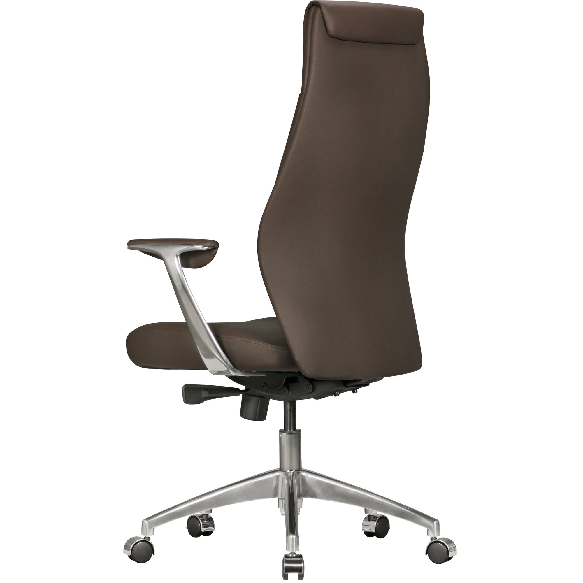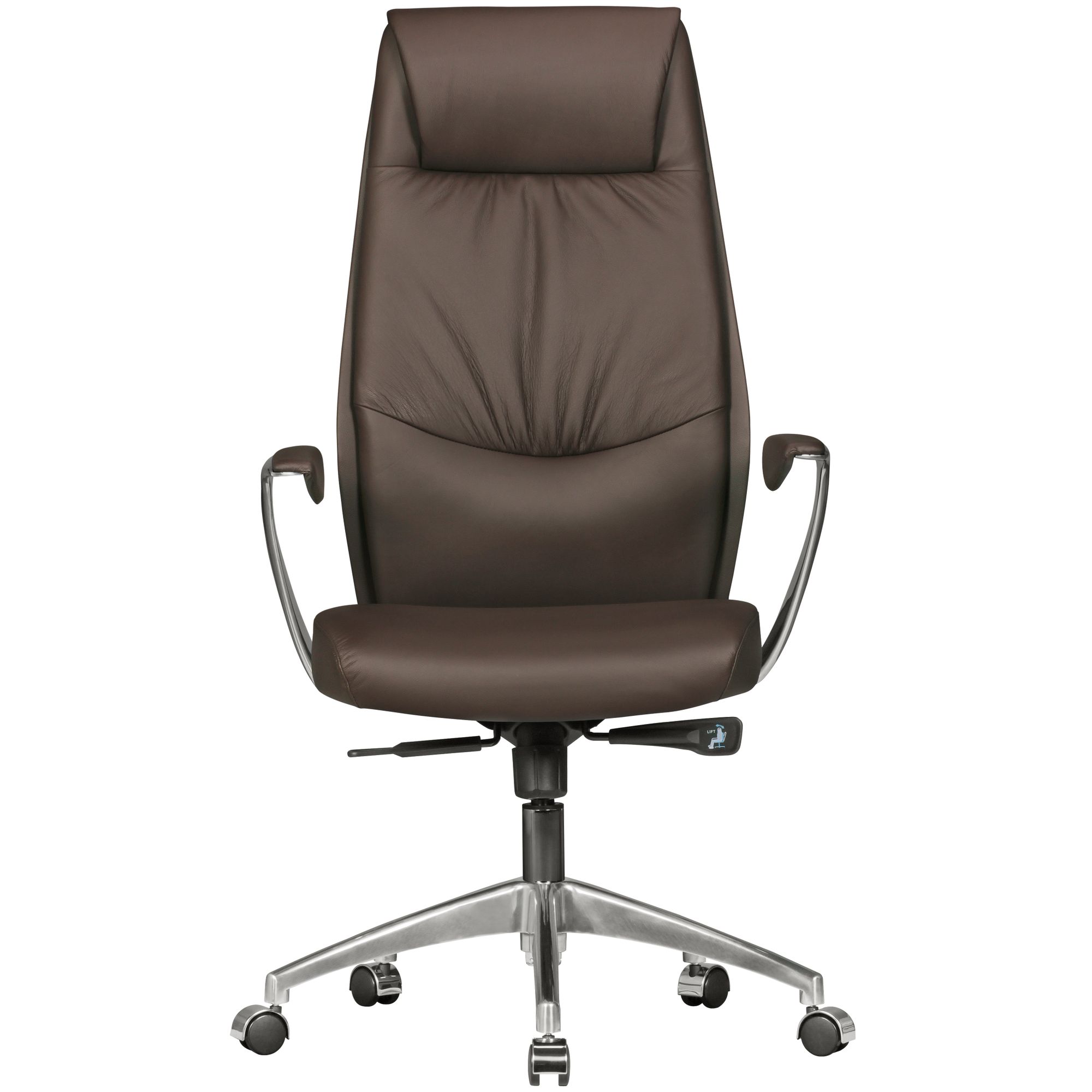 Comfortable XXL office chair in genuine brown leather, designed for heavy use and ergonomic support with a weight-adjustable synchro mechanism. Aluminum armrests with soft pads enable ergonomic seating posture. Wide backrest and seat ensure superior comfort.
