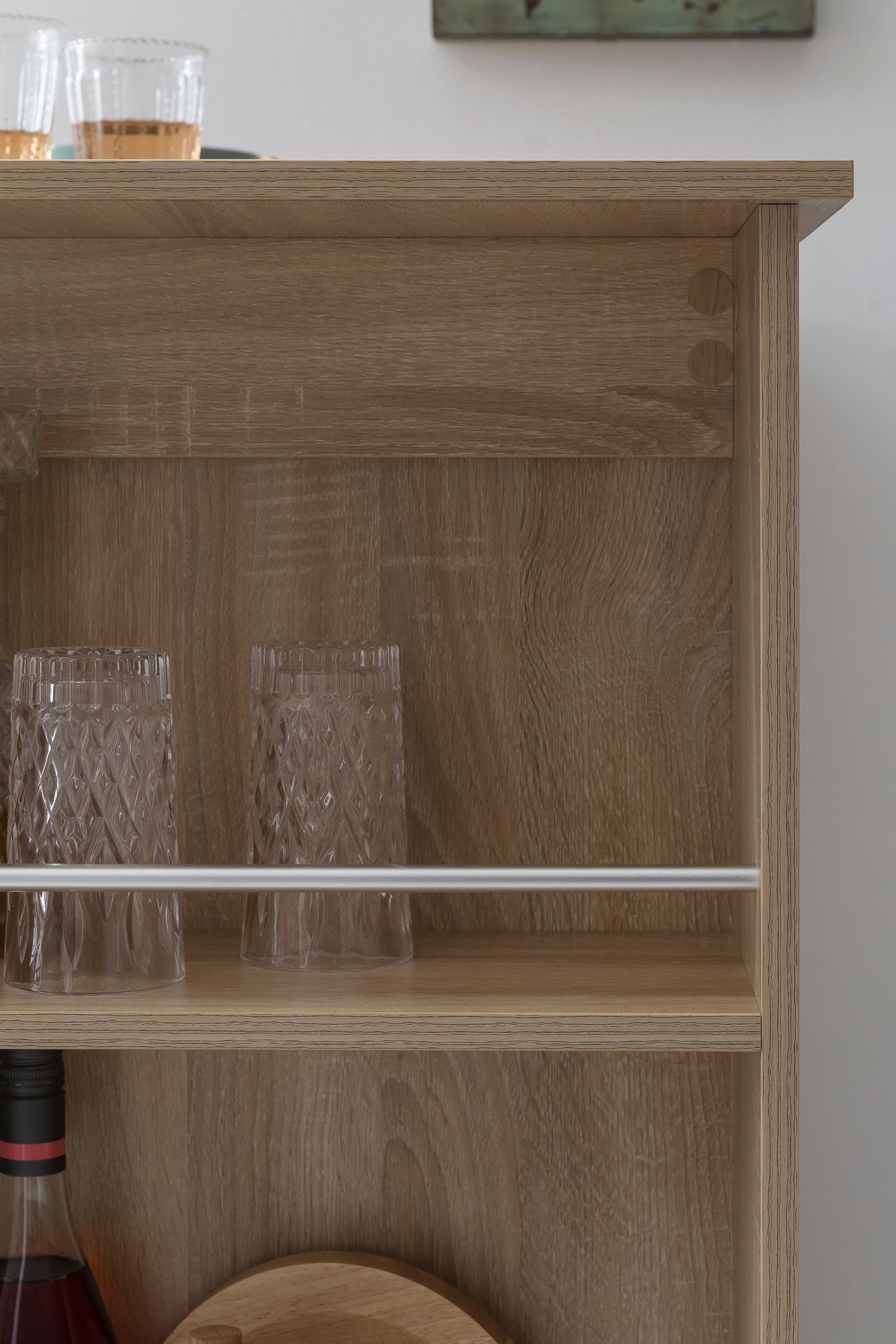 This Sonoma wooden bar table combines modern design with practical storage solutions. Its spacious top surface is perfect for drinks, dishes, and snacks, while three integrated compartments offer elegant storage for wine bottles, glasses, and kitchen utensils.
