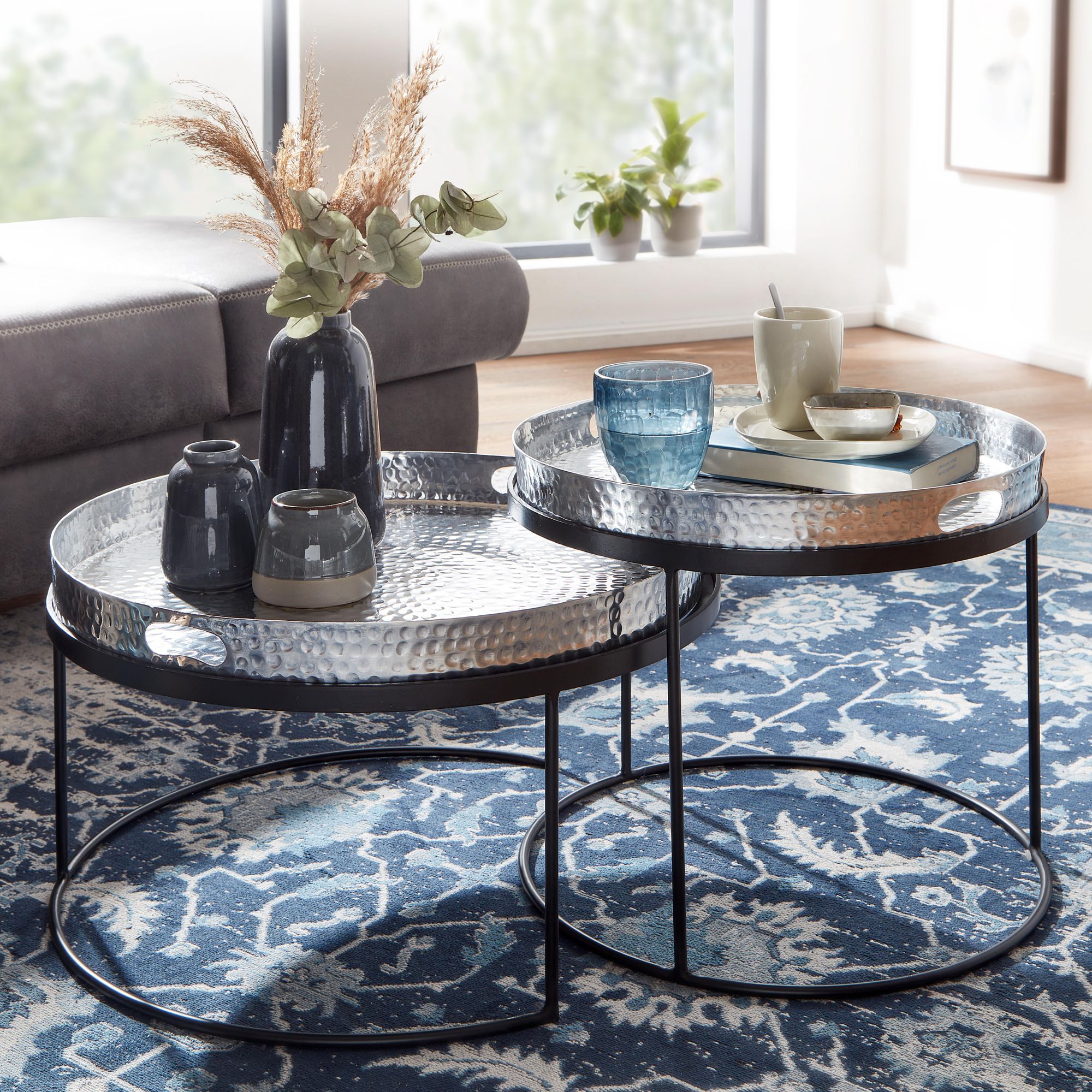 Stylish 2-piece coffee table set featuring silver hammered aluminum tabletops paired with sturdy black lacquered steel frames. Each table includes removable trays with integrated handles for easy carrying. Modern design ideal for contemporary living spaces.