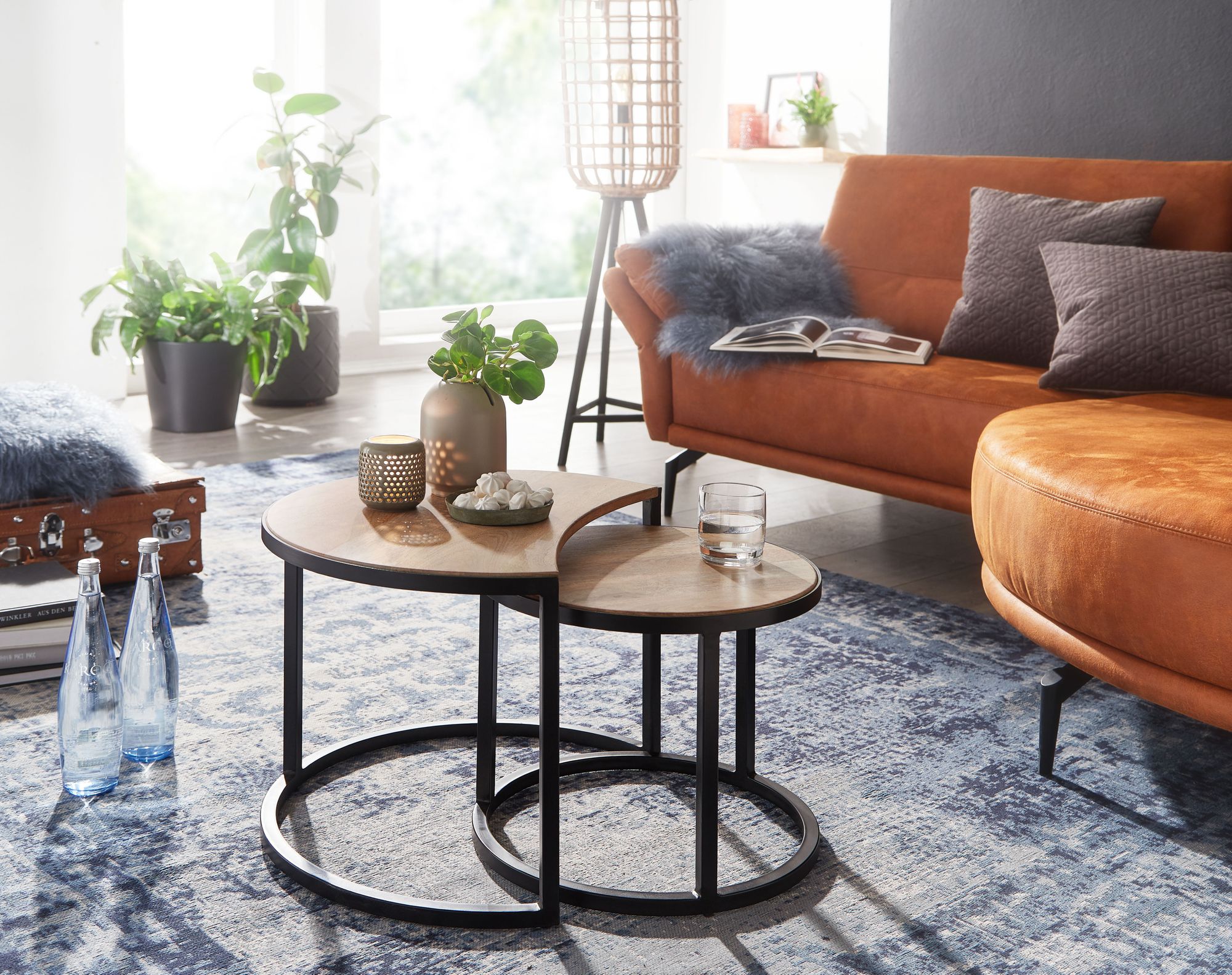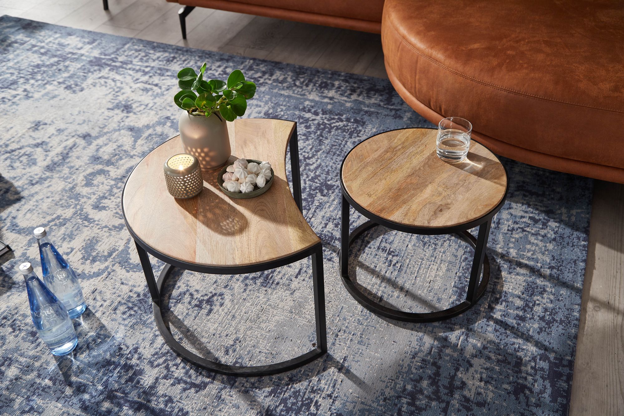 Discover this set of 2 round coffee tables in industrial style, perfectly combining the charm of light mango solid wood with the durability of black metal. Each handcrafted table offers a unique and authentic piece of furniture for your living room, featuring practical dimensions and clean design.