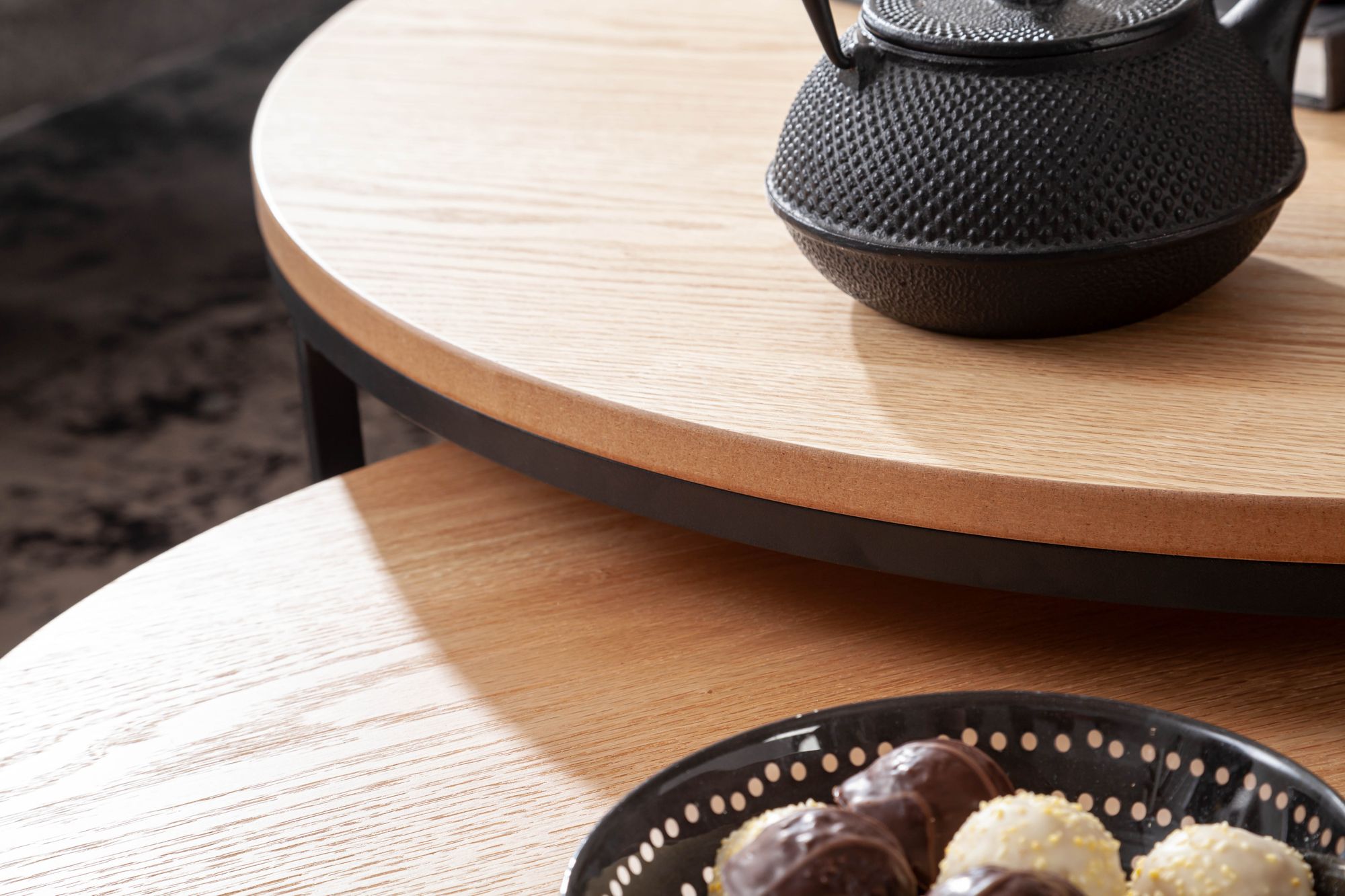 Add warmth and natural style to your home with this 2-piece set of round coffee tables featuring oak veneer MDF tops and matte black metal frames. The wood-metal contrast creates a modern yet cozy atmosphere.