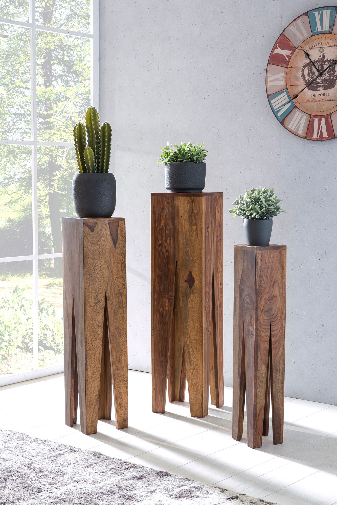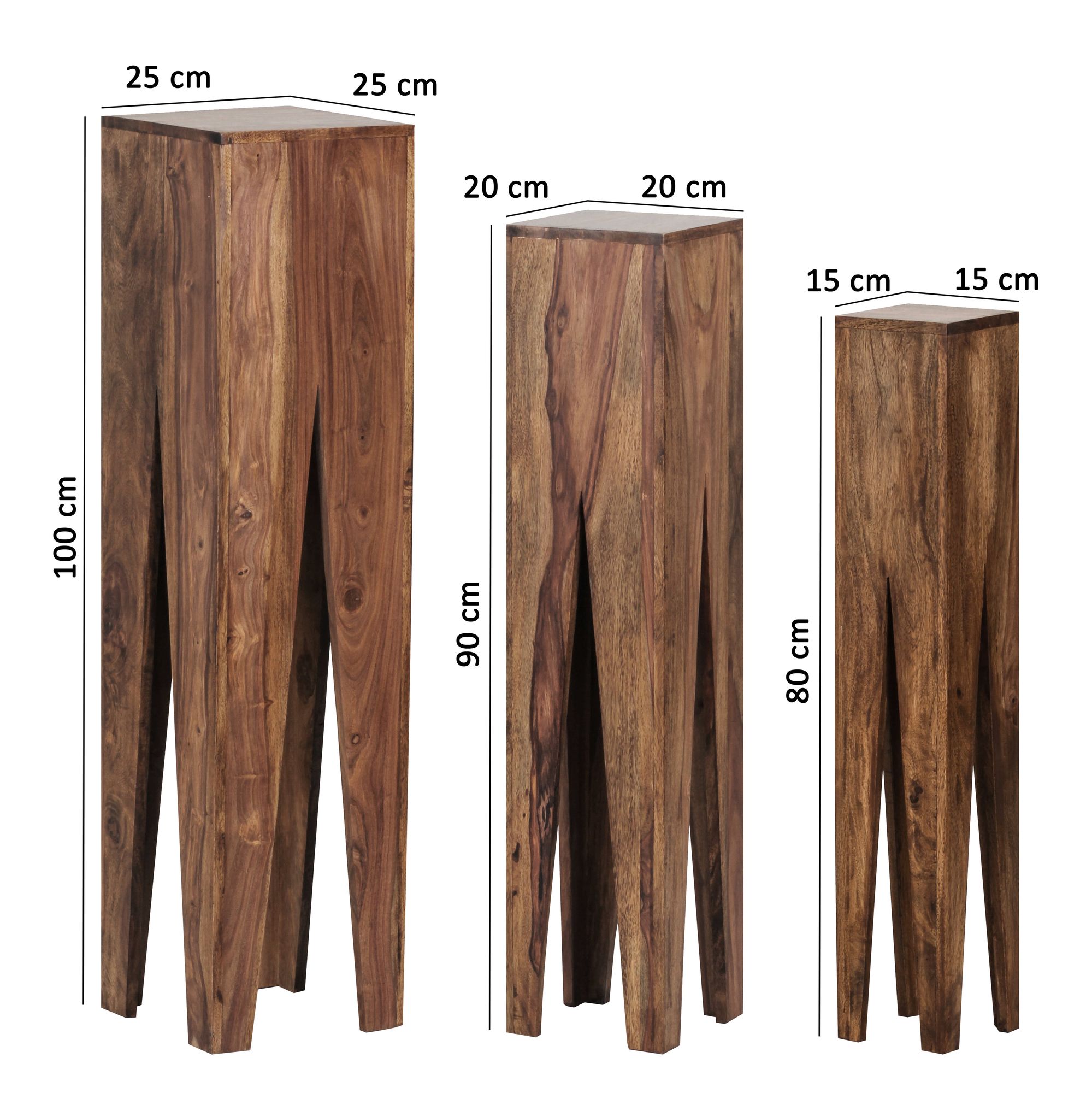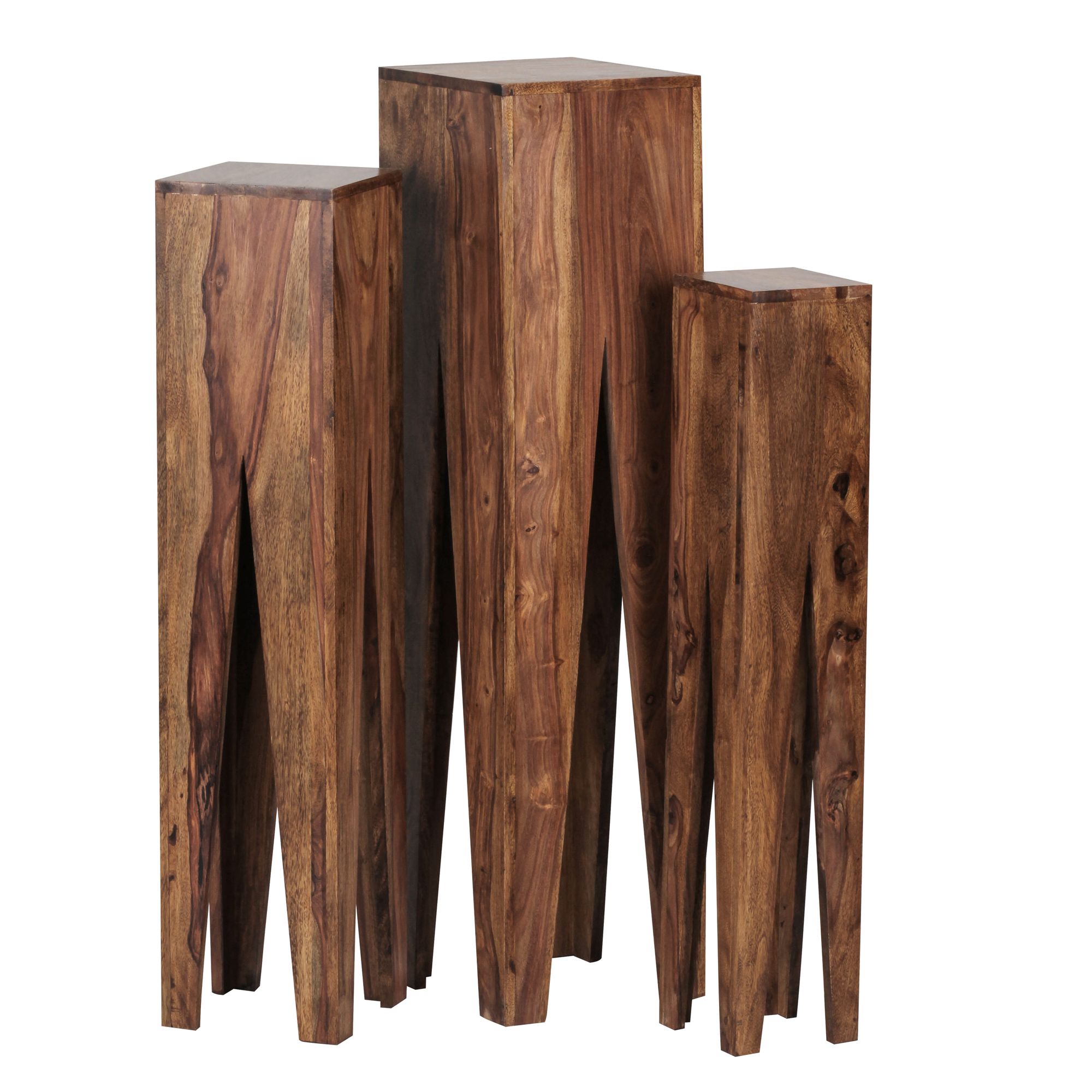 This 3-piece Sheesham solid wood side table set in brown combines functionality and modern elegance with its square design and column-like legs. Perfect for displaying decorative items, each table is a unique handcrafted piece.