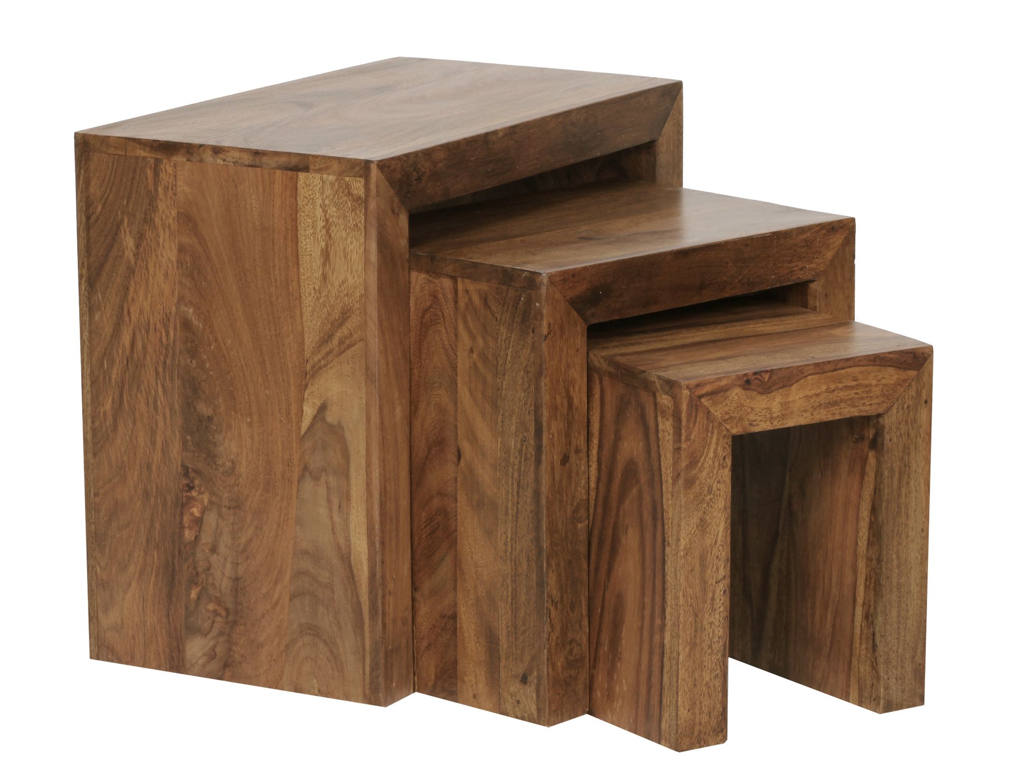 Explore this 3-piece nesting table set crafted from solid Sheesham wood in dark brown, perfect for a country-style living room. The natural finish highlights the unique Sheesham wood grain, offering each table as a handcrafted and one-of-a-kind piece.