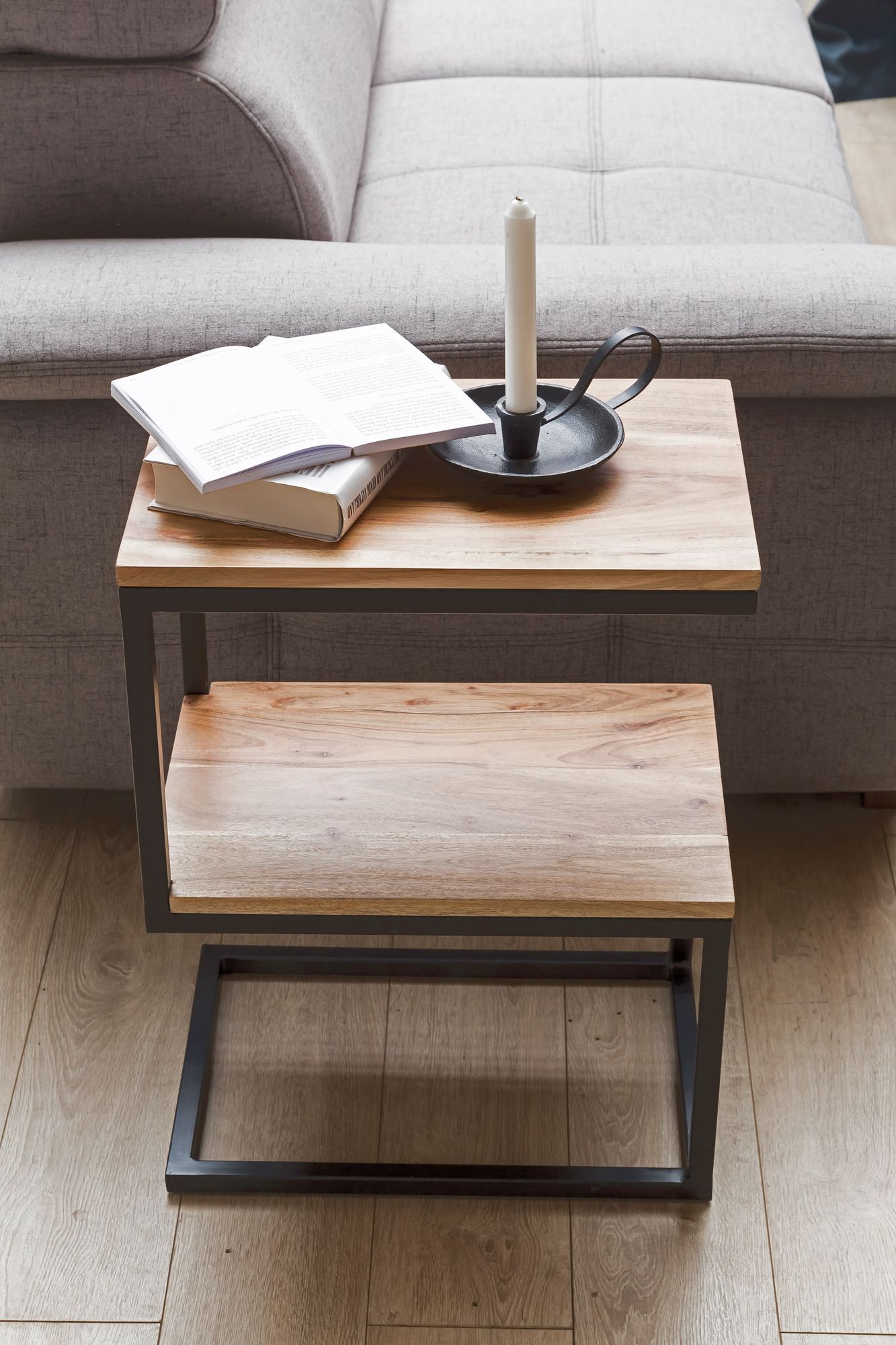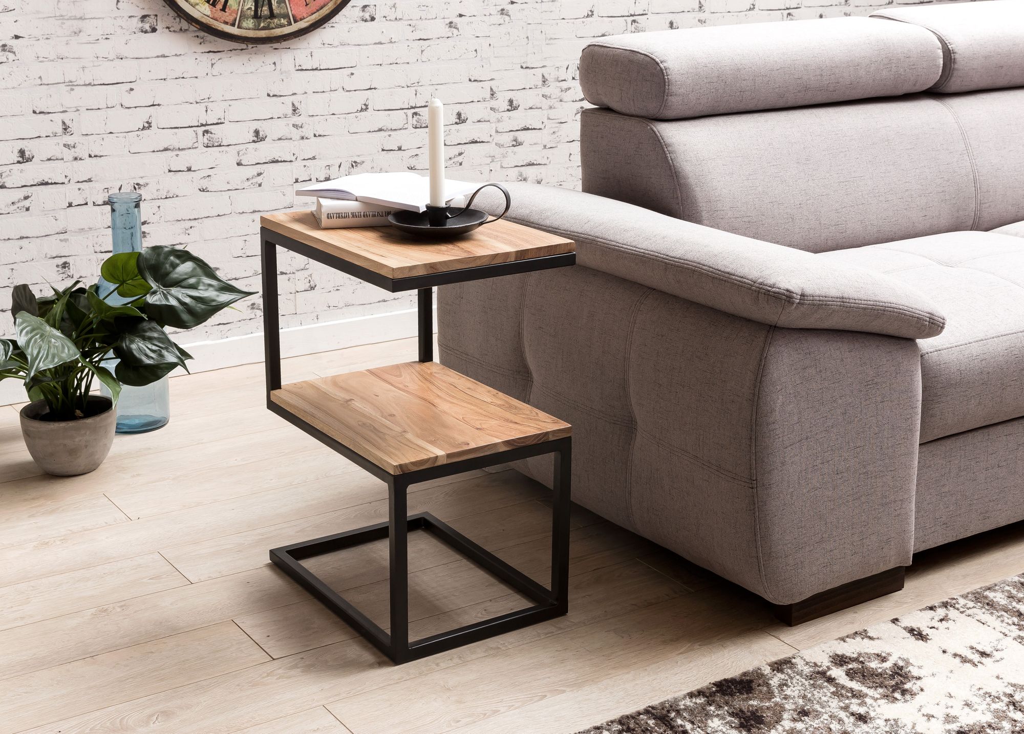 The AKOLA side table features an elegant S-shape crafted from solid Acacia wood and matte black metal, ideal for rustic and modern interiors.