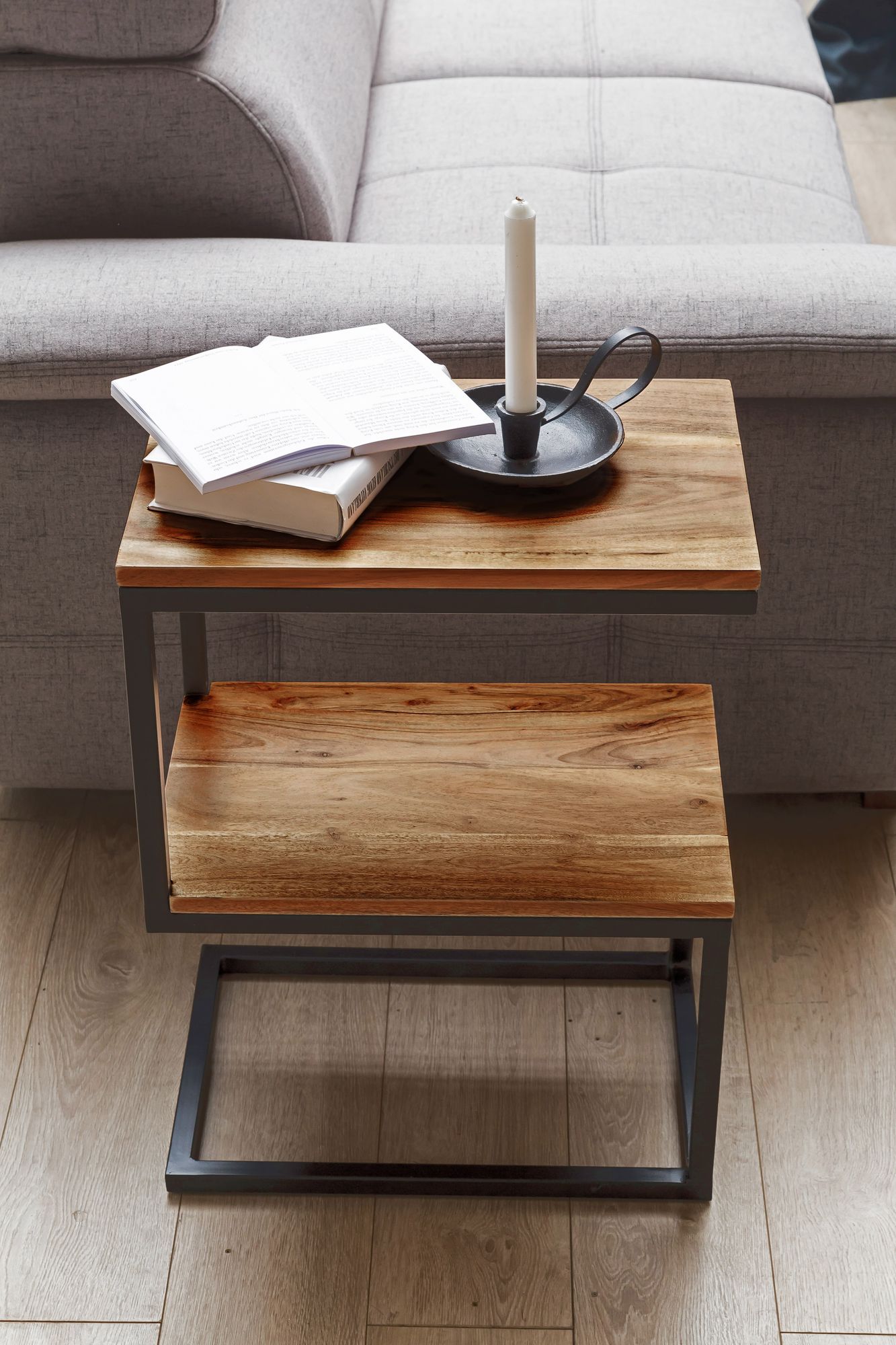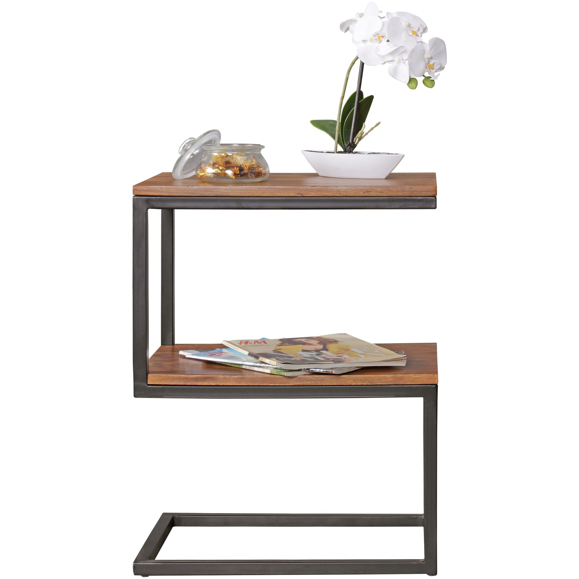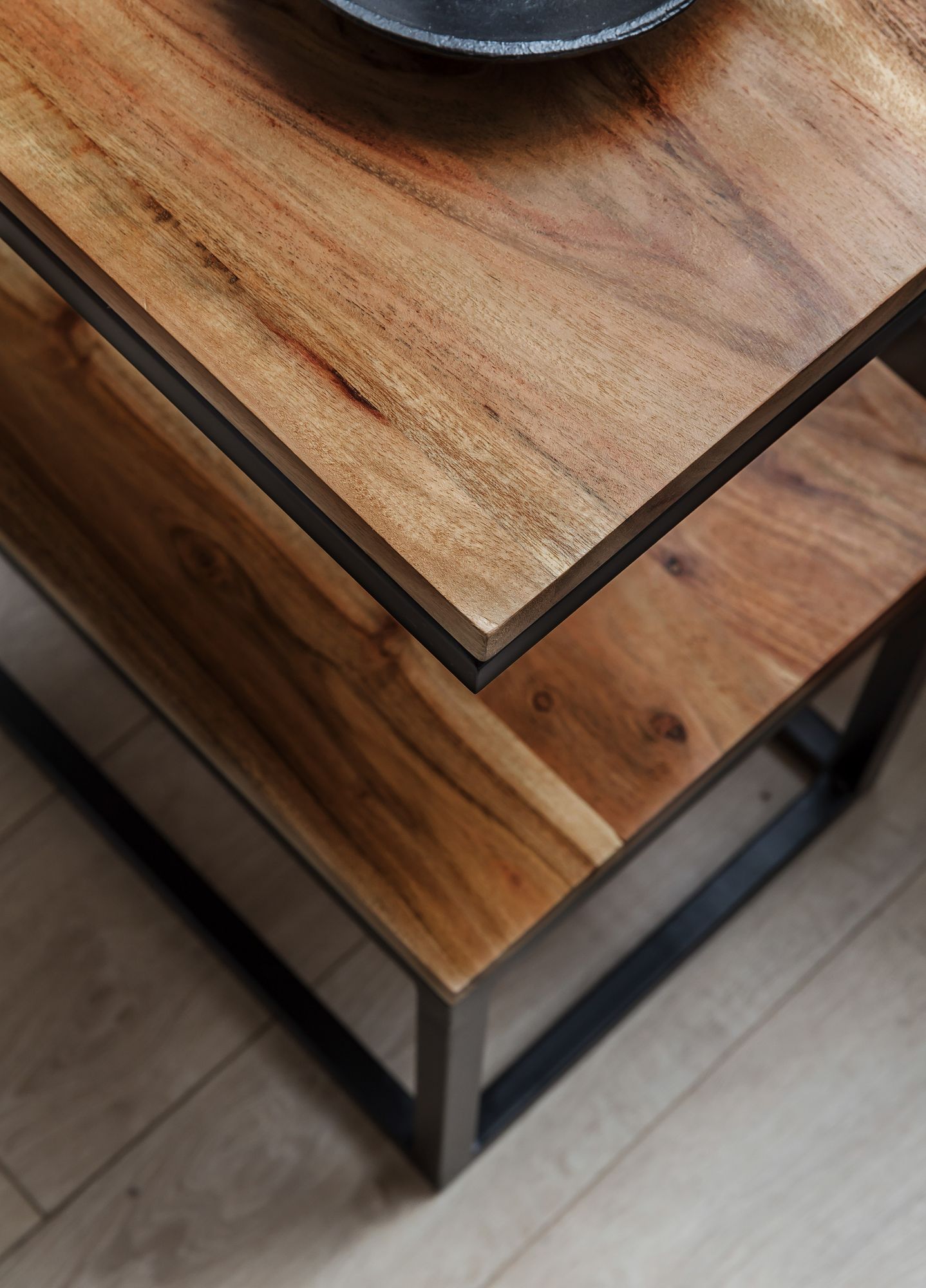 The AKOLA side table features an elegant S-shape design combining solid Sheesham wood and matte black metal, blending perfectly into rustic or modern interiors.
