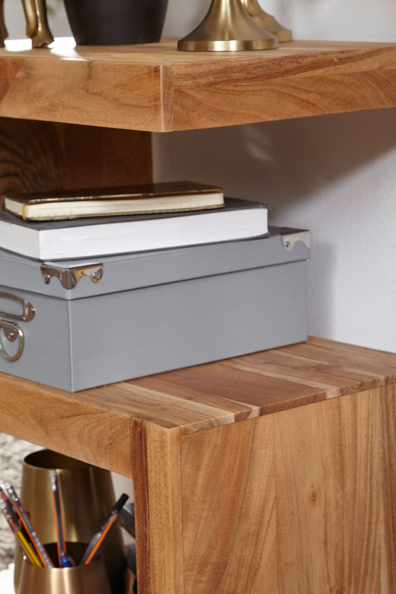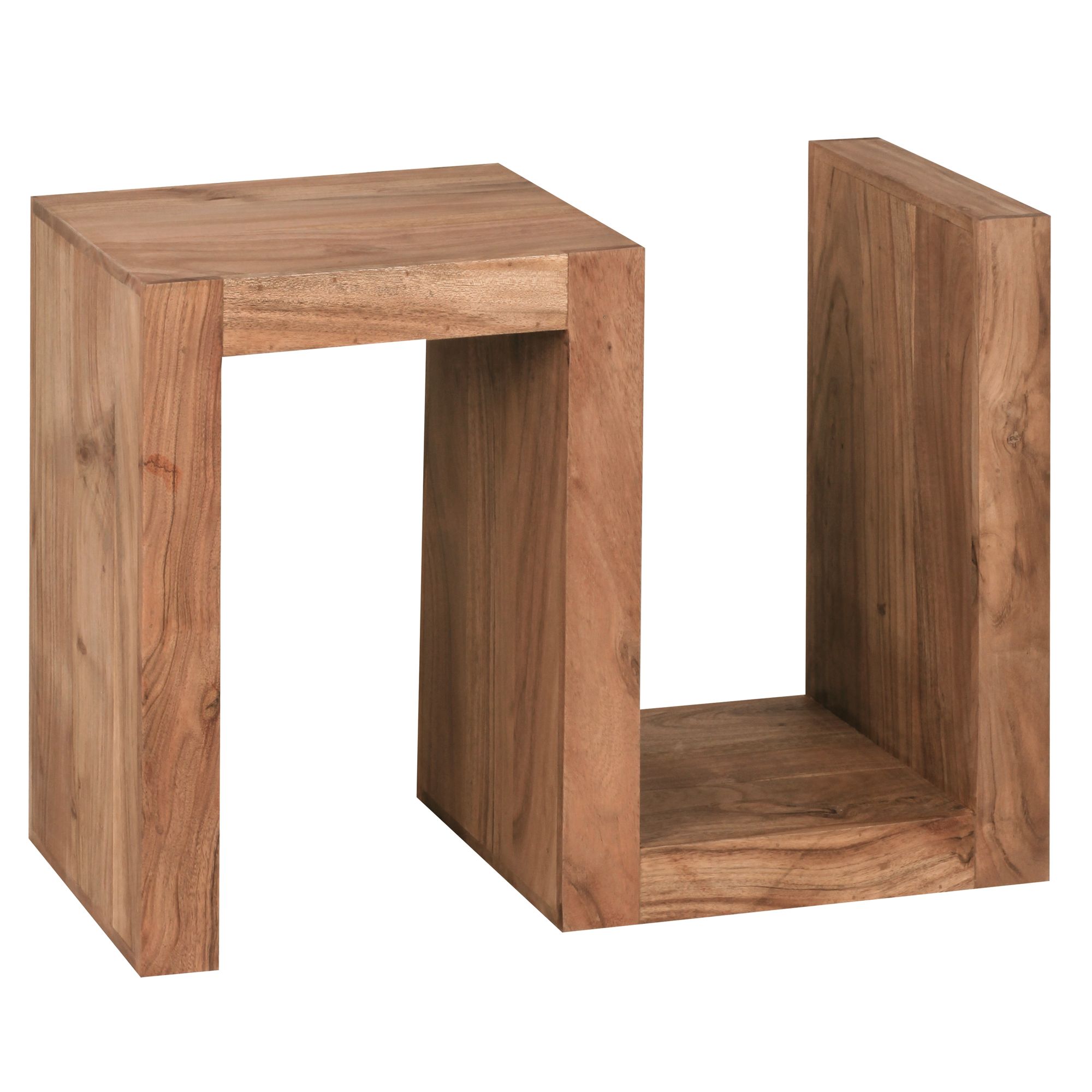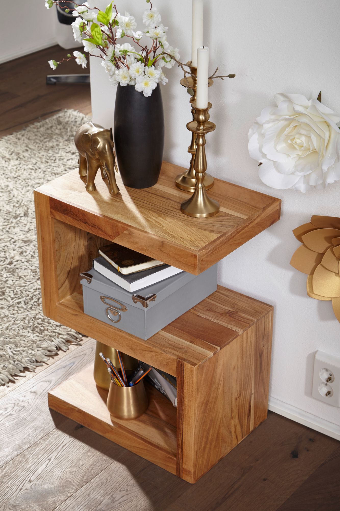 Experience the MUMBAI side table crafted from solid acacia wood, standing 60 cm tall, perfect for your living room. The unique S-shaped design creates additional shelving areas ideal for magazines or decorative items.