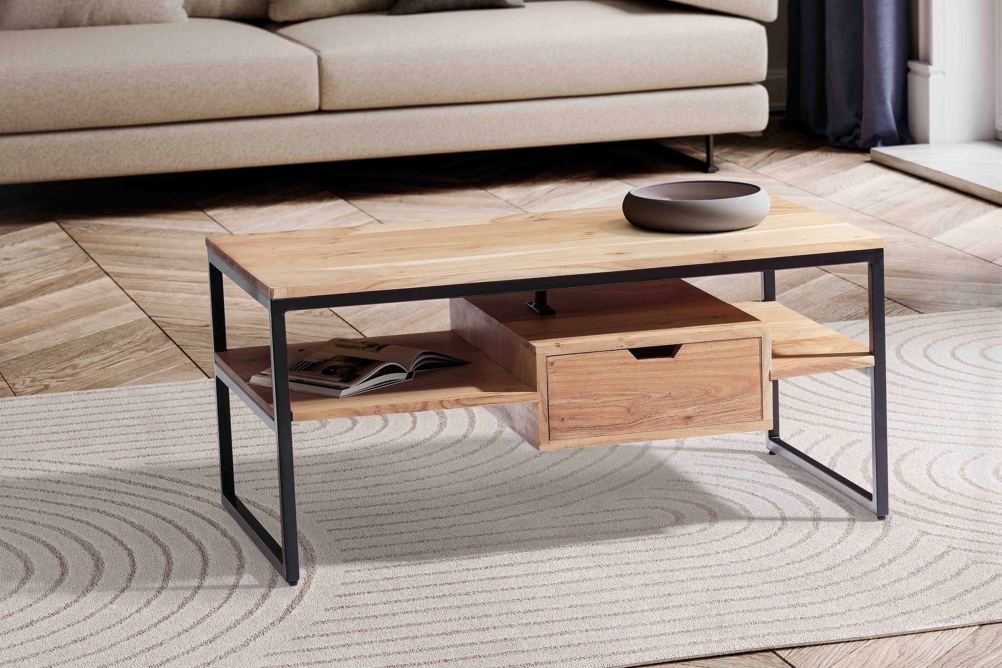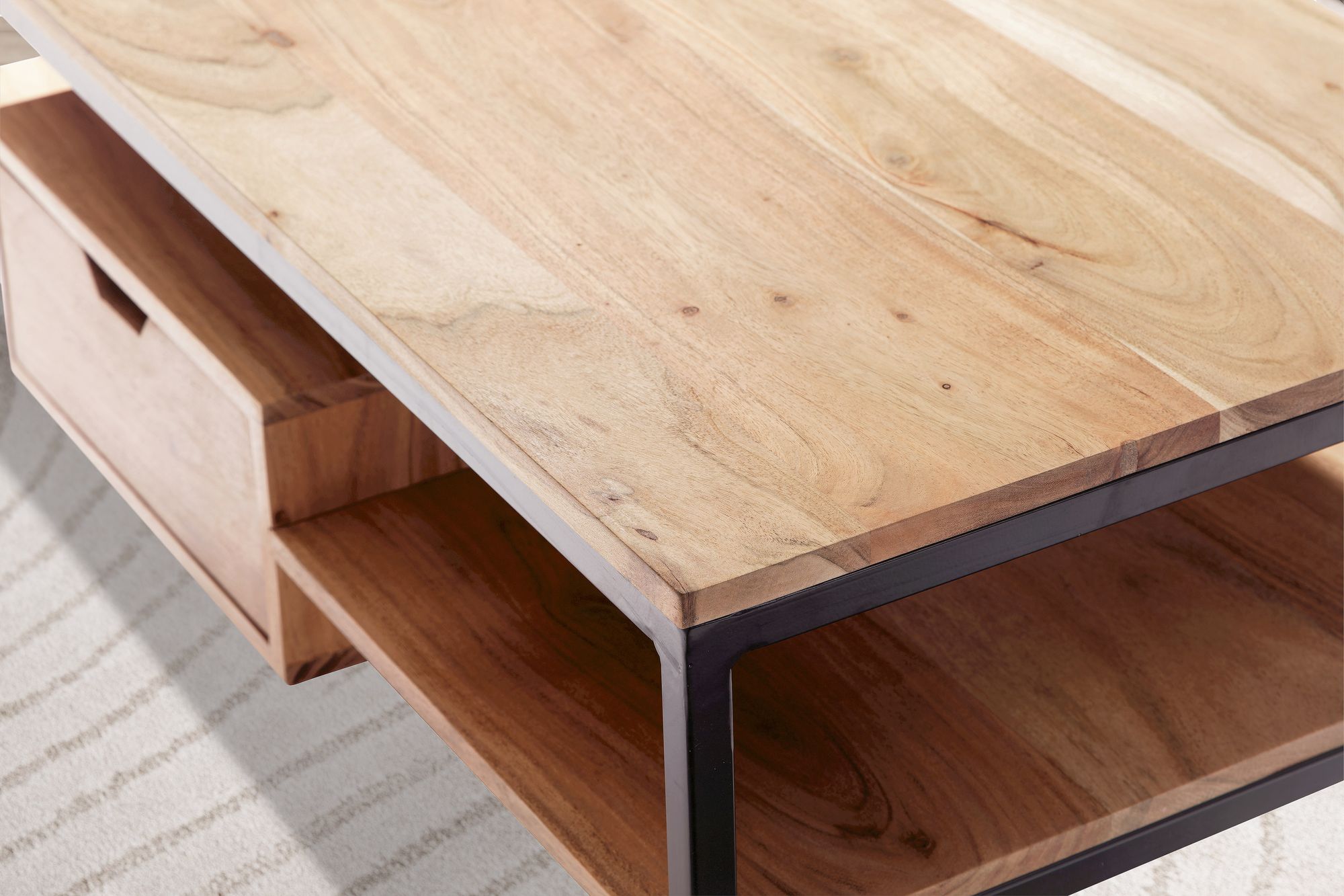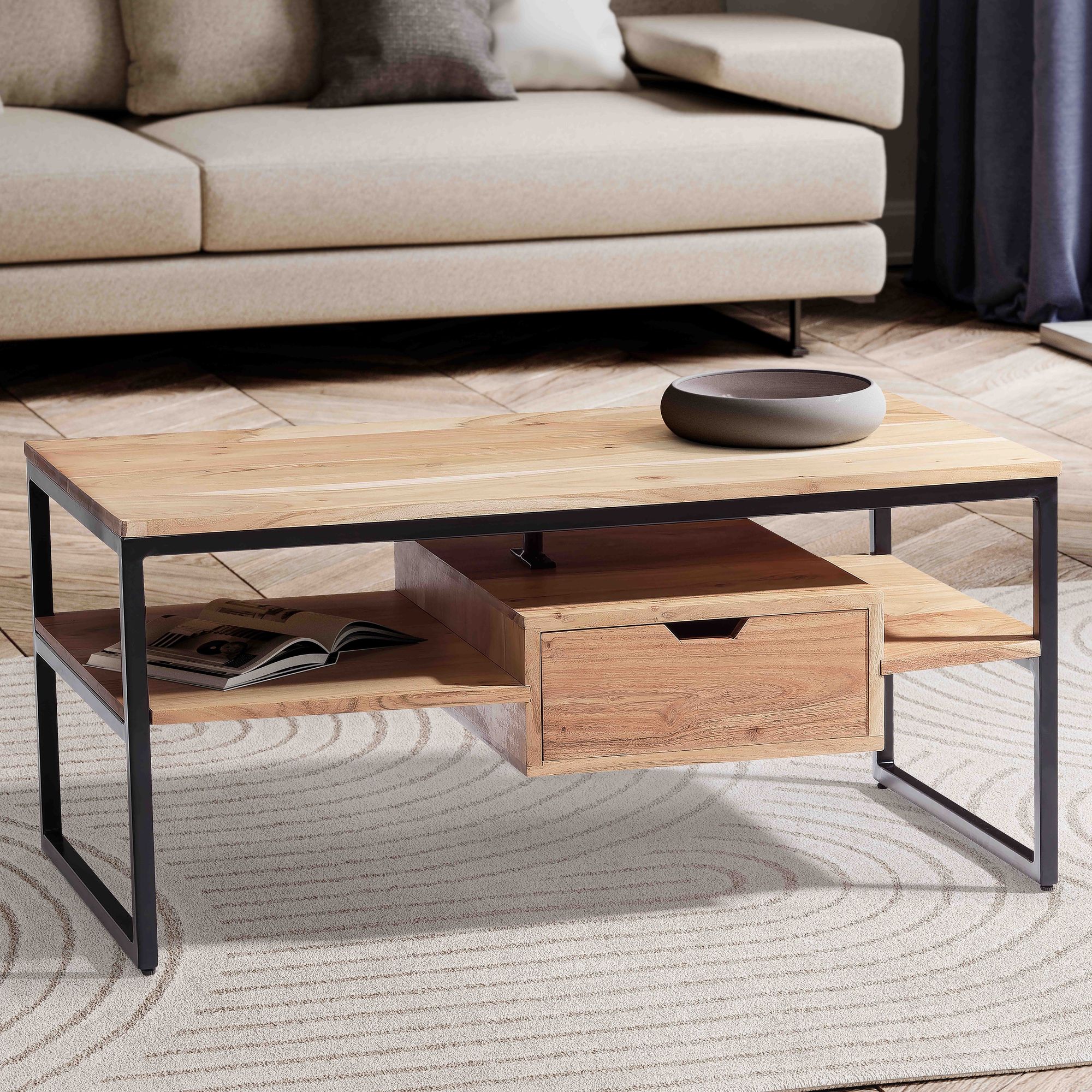 This rectangular coffee table with drawer combines modern design and optimal functionality. Made of varnished solid acacia wood with a black metal frame, it offers practical storage and handcrafted quality.