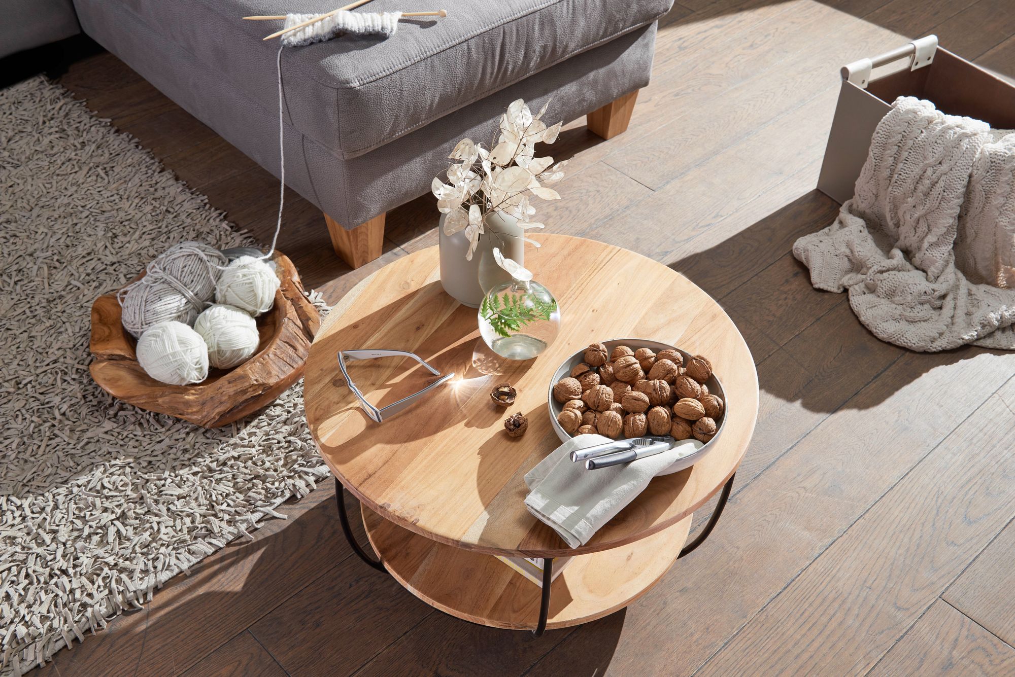 Add an industrial and warm touch to your living room with this round coffee table made from solid brown acacia wood. The circular tabletop provides ample space for your everyday items, while the second shelf offers practical and accessible storage. The matte black metal frame ensures stability and durability, complementing the modern design.