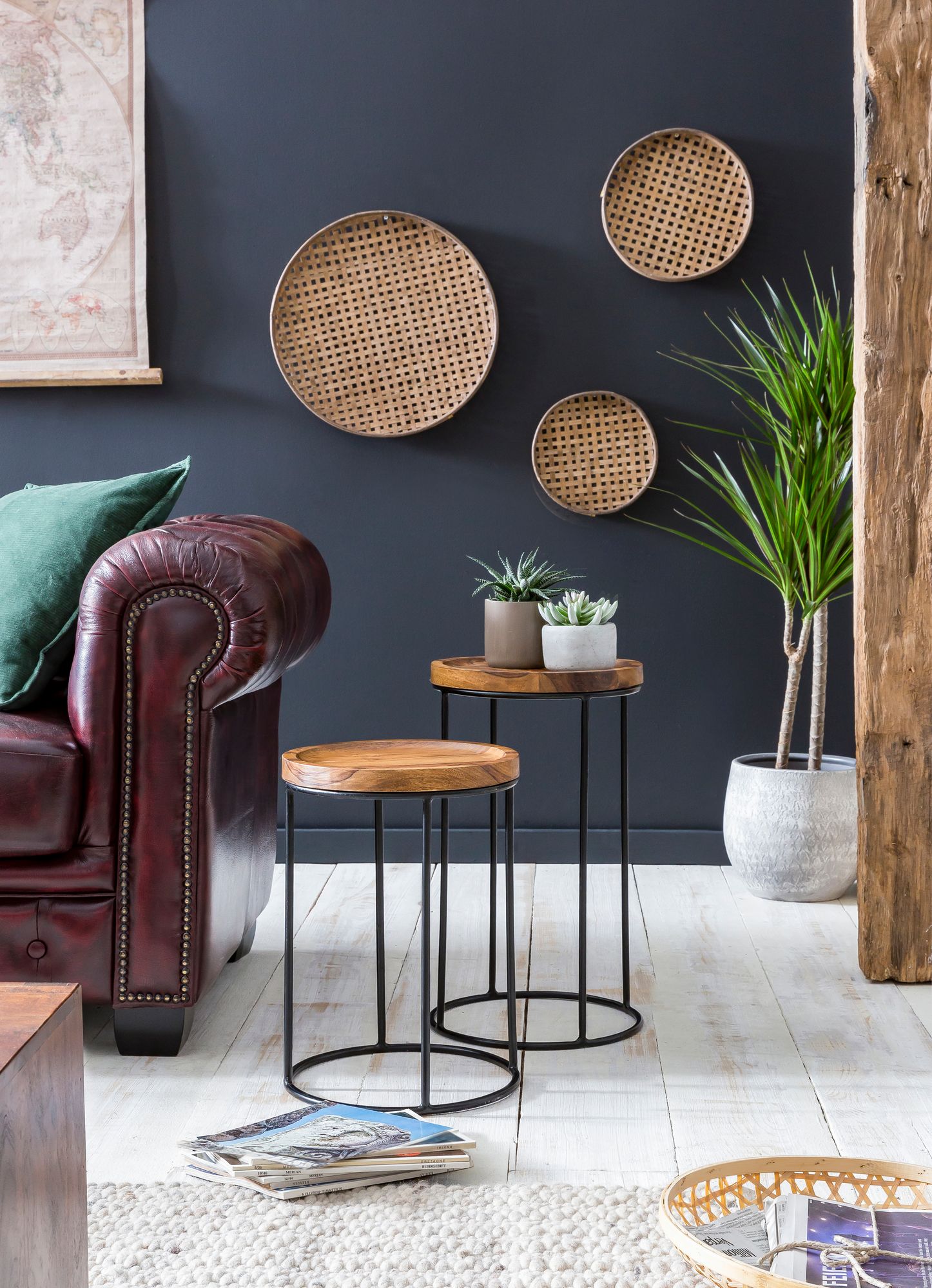 - Versatile tables usable together or separately for living spaces