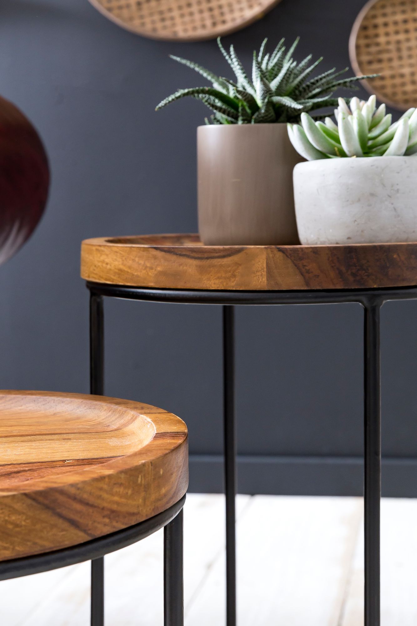 Add an industrial charm to your living room with this set of 2 Sheesham solid wood side tables in brown with matte black metal frames. Each hand-crafted table offers a natural and sturdy finish.