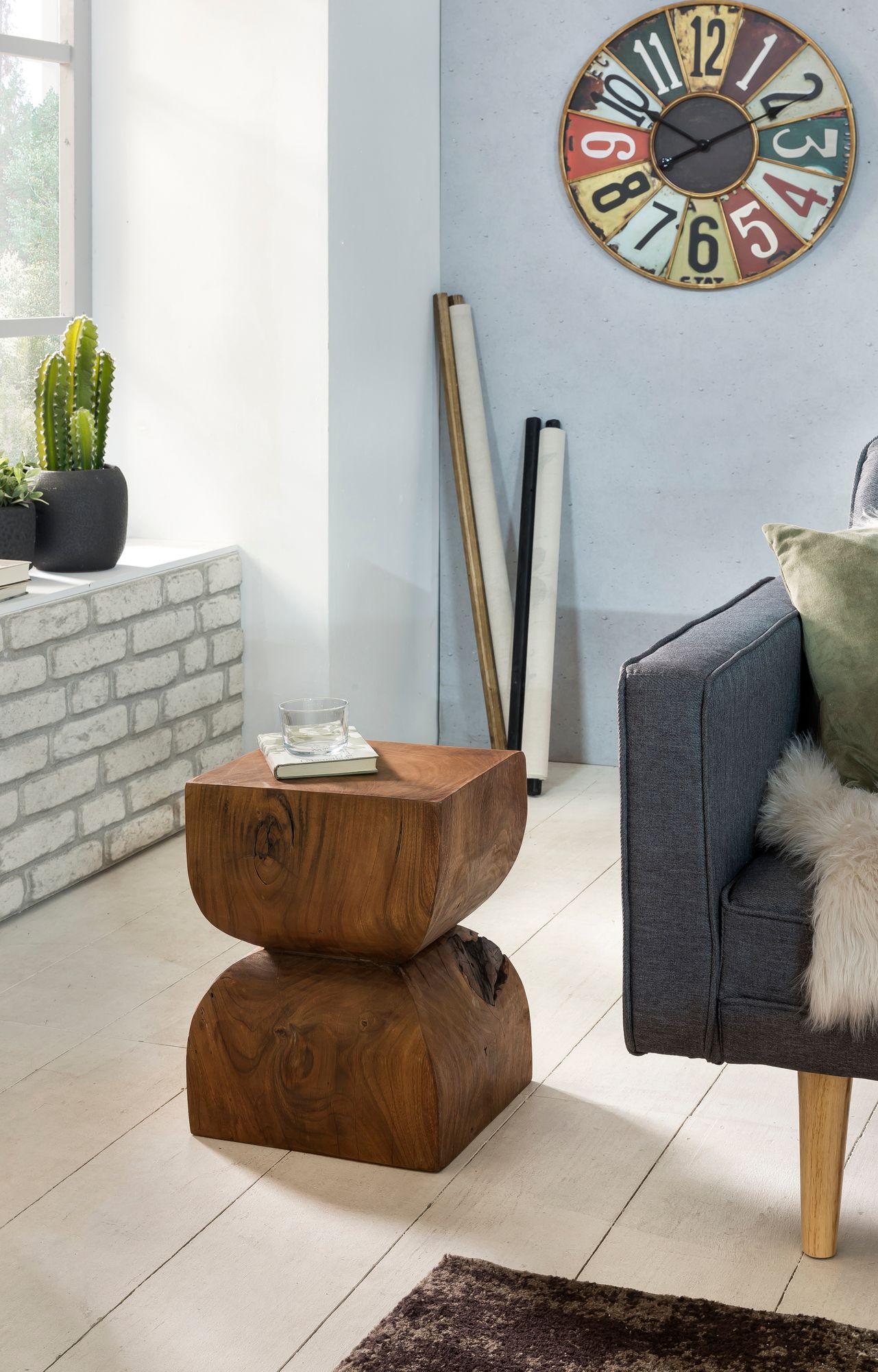 Add warmth and authenticity to your home with this Sheesham solid wood side table in brown, featuring a rustic design with rounded edges and an hourglass shape. Each piece is unique due to the natural wood grain and knots.
