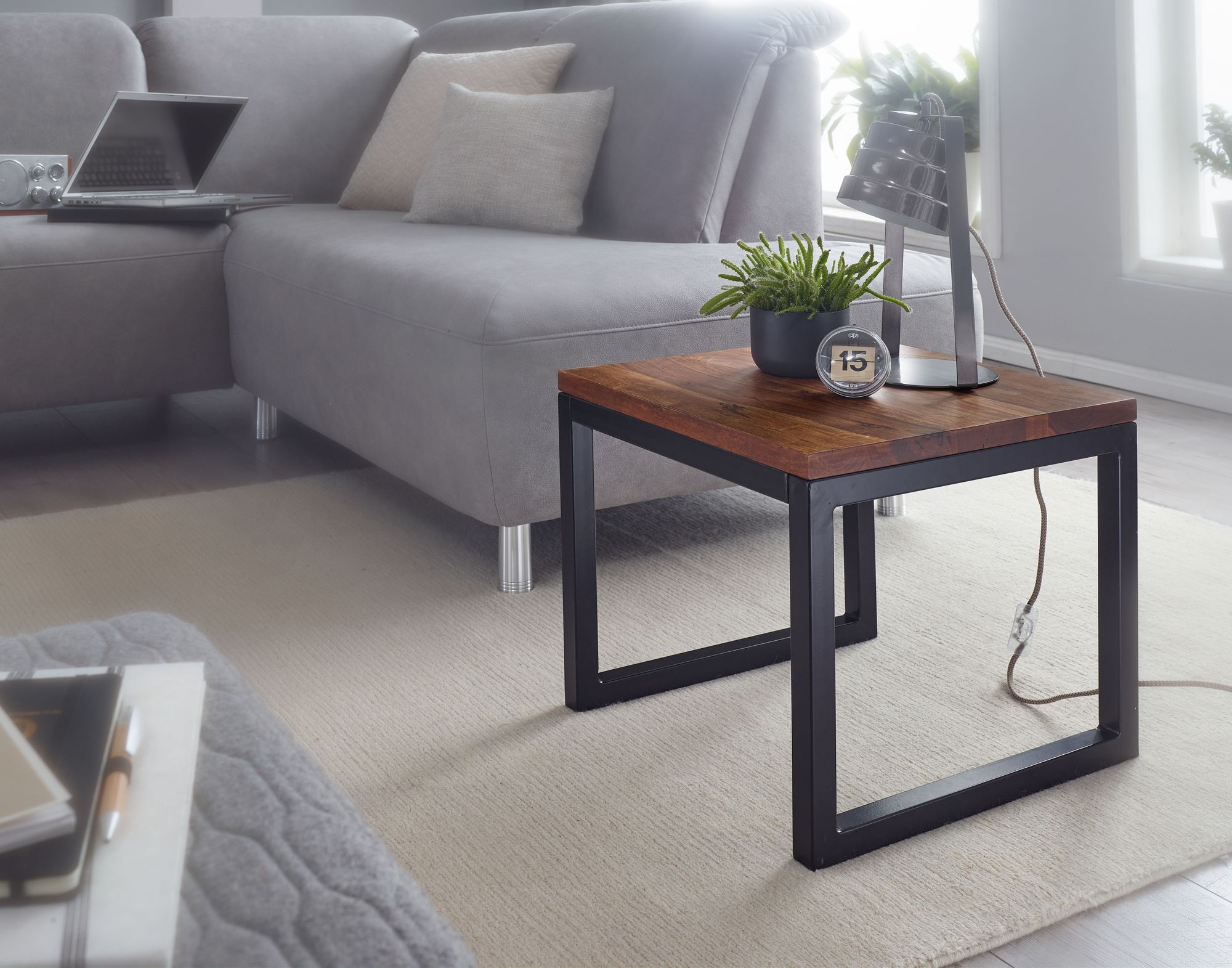 Add a warm industrial touch to your home with this side table made of solid Sheesham wood and black metal. Featuring a spacious top and sturdy legs, it combines elegance with functionality.