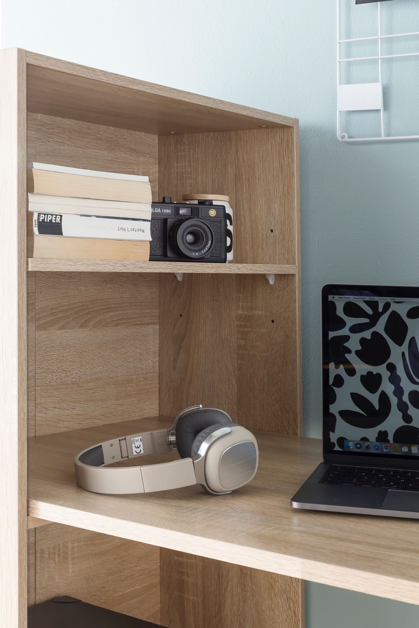 This contemporary desk features a Sonoma particleboard finish, combining warm tones with a functional design including integrated shelves to maximize storage space.