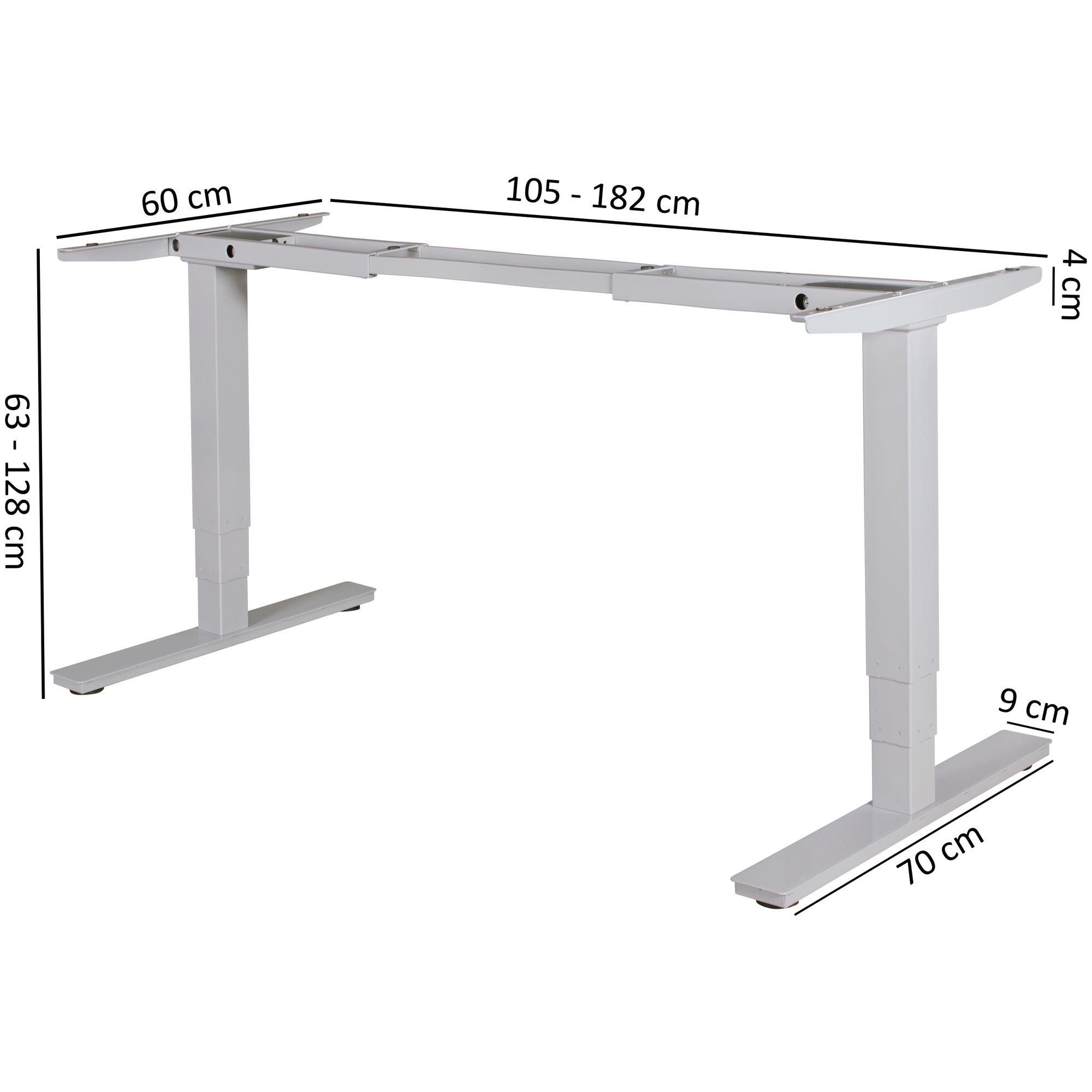 Electric height-adjustable desk frame 63-128 cm with memory function, silver T-leg design, adjustable width 105-182 cm