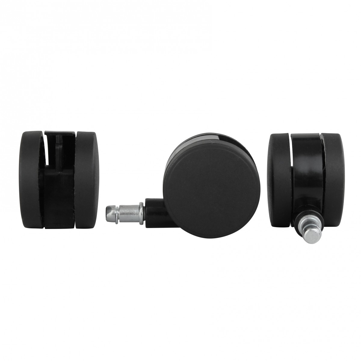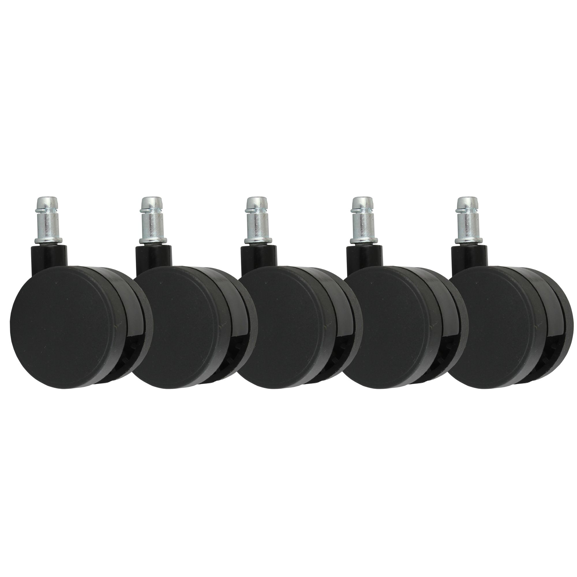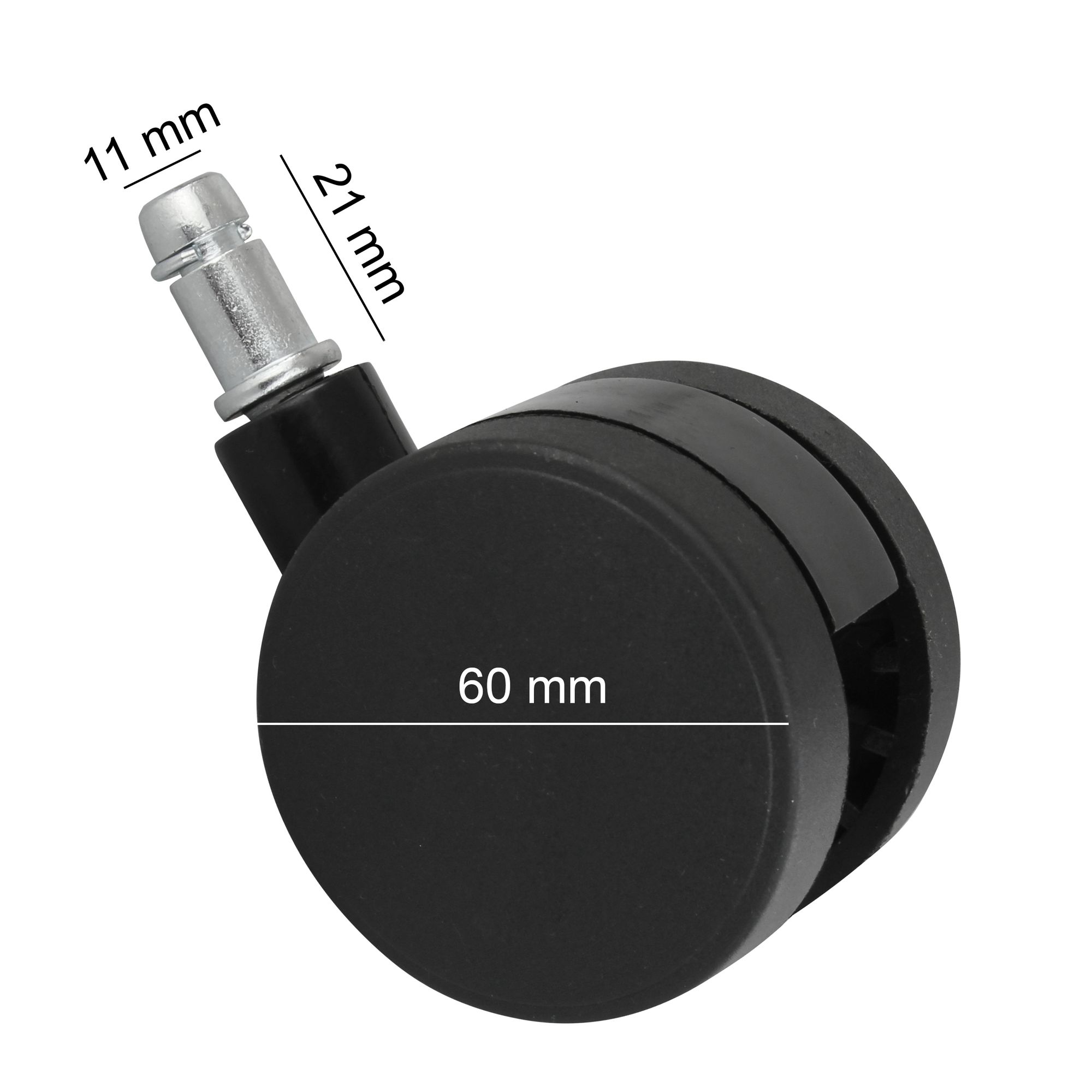 This set of 5 black polyurethane casters is designed for office chairs with an 11 mm stem. The large 60 mm diameter ensures smooth mobility on carpet and felt floors.